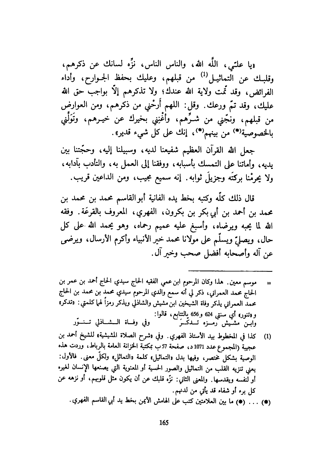 قَالَ ذَلِك كُله وَكتبه بِخَط يَده الفانية أَبُو الْقَاسِم مُحَمَّد بن مُحَمَّد بن مُحَمَّد بن أَحْمد بن أبي بكر بن بكرون الفِهري الْمَعْرُوف بِالْقُرْعَةِ وَفقه الله لما يُحِبهُ ويرضاه وأسبغ عَلَيْهِ عميم رحماه وَهُوَ يحمد الله على كل حَال وَيُصلي وَيسلم على مَوْلَانَا مُحَمَّد خير الْأَنْبِيَاء وَأكْرم الأرسال ويرضى عَن آله وَأَصْحَابه أفضل صحب وَخير آل