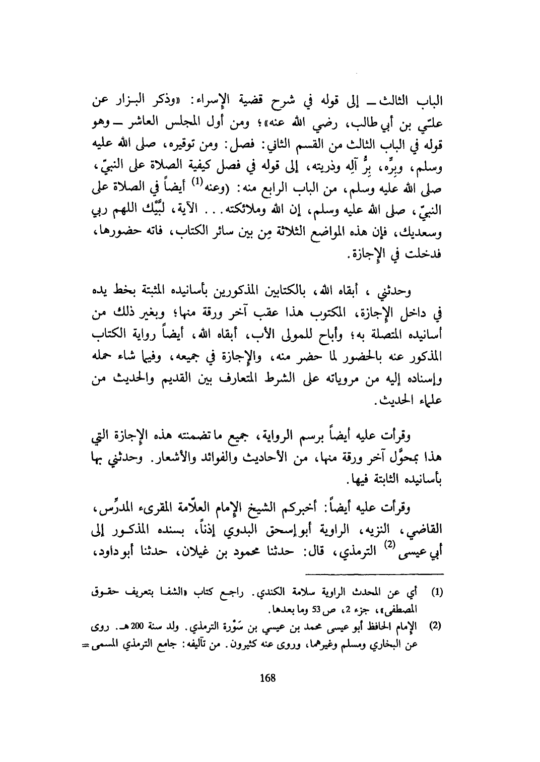 وقرأت عَلَيْهِ أَيْضا أخْبركُم الشَّيْخ الإِمَام الْعَلامَة المقرىء الْمدرس القَاضِي النزيه الراوية أَبُو إِسْحَق البدوي إِذْنا بِسَنَدِهِ الْمَذْكُور إِلَى أبي عِيسَى التِّرْمِذِيّ قَالَ حَدثنَا مَحْمُود بن غيلَان حَدثنَا أَبُو دَاوُد