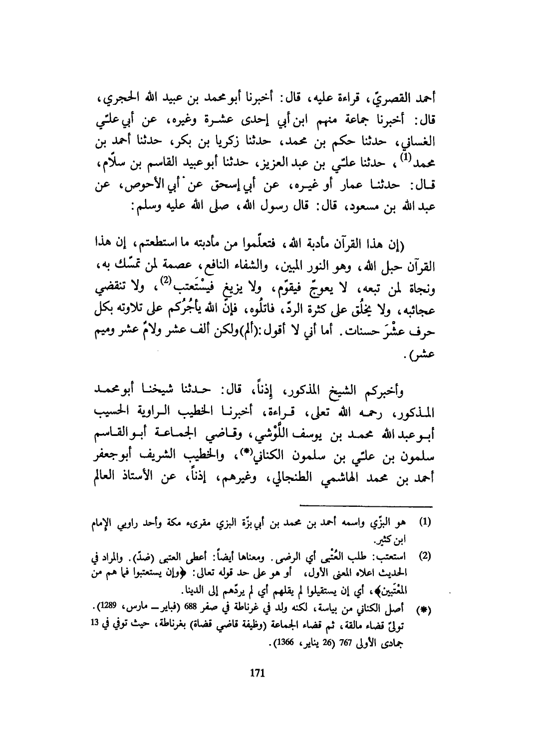 وأخبركم الشَّيْخ الْمَذْكُور إِذْنا قَالَ حَدثنَا شَيخنَا أَبُو مُحَمَّد الْمَذْكُور رَحمَه الله تعلى قِرَاءَة أخبرنَا الْخَطِيب الراوية الحسيب أَبُو عبد الله مُحَمَّد بن يُوسُف اللوشي وقاضي الْجَمَاعَة أَبُو الْقَاسِم سَلمُون بن عَليّ بن سَلمُون الْكِنَانِي والخطيب الشريف أَبُو جَعْفَر أَحْمد بن مُحَمَّد الْهَاشِمِي الطنجالي وَغَيرهم إِذْنا عَن الْأُسْتَاذ الْعَالم