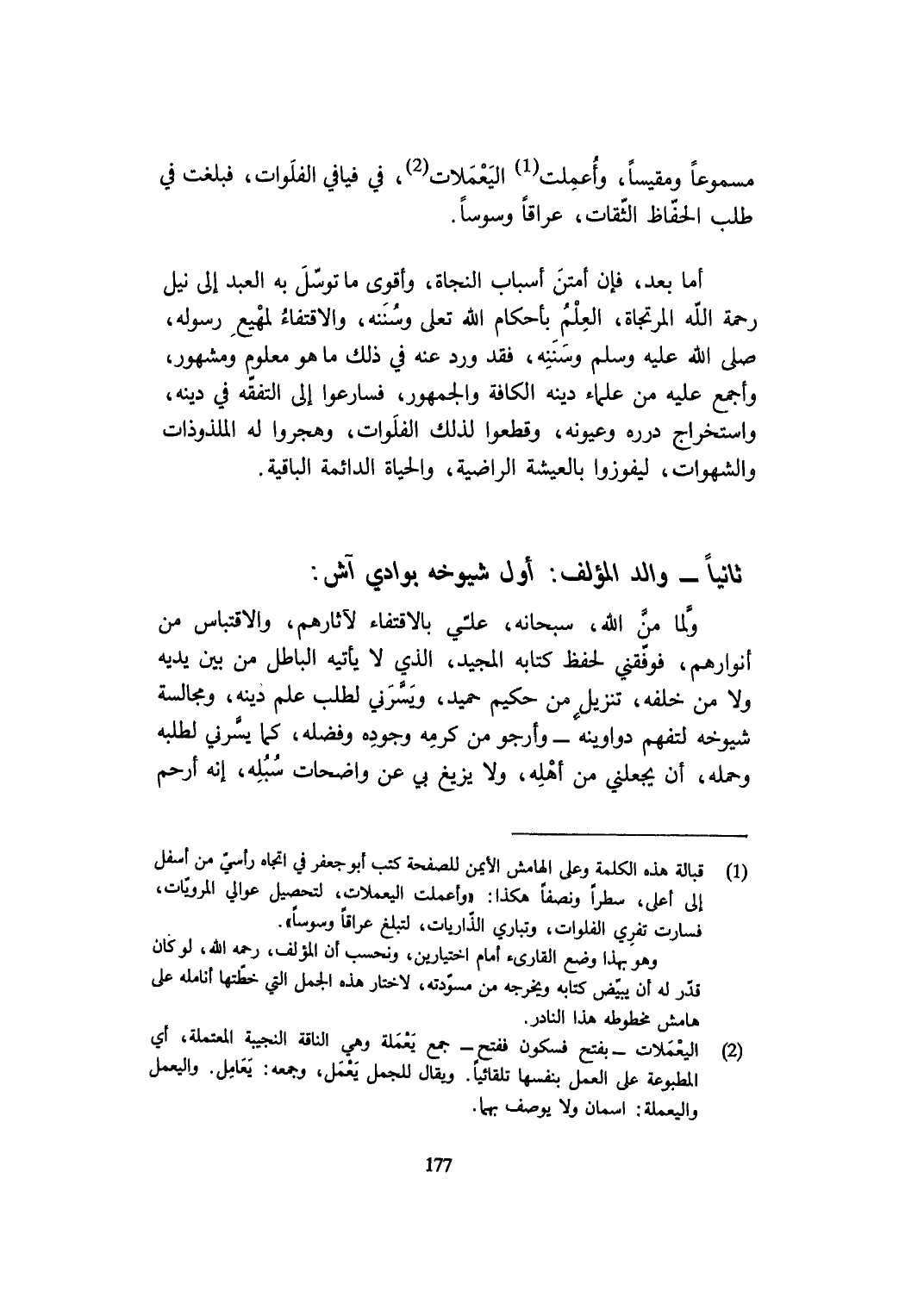 وَلما من الله سُبْحَانَهُ عَليّ بالاقتفاء لآثارهم والاقتباس من أنوارهم فوفقني لحفظ كِتَابه الْمجِيد الَّذِي لَا يَأْتِيهِ الْبَاطِل من بَين يَدَيْهِ وَلَا من خَلفه تَنْزِيل من حَكِيم حميد ويسرني لطلب علم دينه ومجالسة شُيُوخه لتفهم دواوينه وَأَرْجُو من كرمه وجوده وفضله كَمَا يسرني لطلبه وَحمله أَن يَجْعَلنِي من أَهله وَلَا يزِيغ بِي عَن واضحات سبله إِنَّه أرْحم