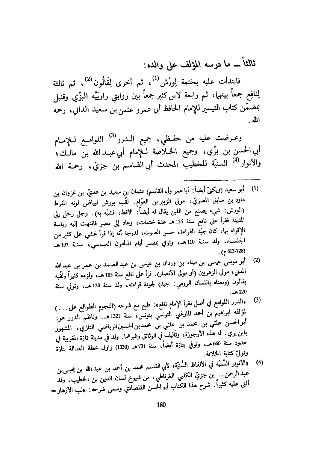 فابتدأت عَلَيْهِ بختمة لورش ثمَّ أُخْرَى لقالون ثمَّ ثَالِثَة لنافع جمعا بَينهمَا ثمَّ رَابِعَة لِابْنِ كثير جمعا بَين روايتي رواييه البزي وقنبل بمضمن كتاب التَّيْسِير للْإِمَام الْحَافِظ أبي عَمْرو عثمن بن سعيد الداني رَحمَه الله