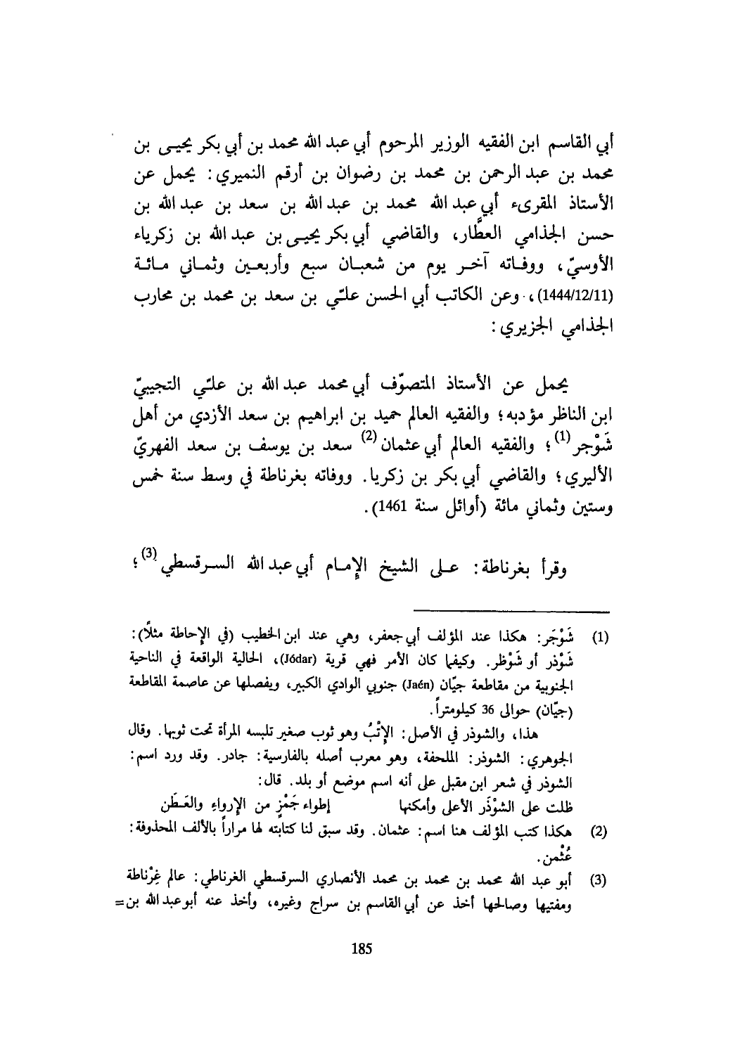 يحمل عَن الْأُسْتَاذ المتصوف أبي مُحَمَّد عبد الله بن عَليّ التجِيبِي ابْن النَّاظر مؤدبه والفقيه الْعَالم حميد بن ابراهيم بن سعد الْأَزْدِيّ من أهل شوجر والفقيه الْعَالم أبي عُثْمَان سعد بن يُوسُف بن سعد الفِهري الأليري وَالْقَاضِي أبي بكر بن زَكَرِيَّا ووفاته بغرناطة فِي وسط سنة خمس وَسِتِّينَ وثماني مائَة أَوَائِل سنة 1461
