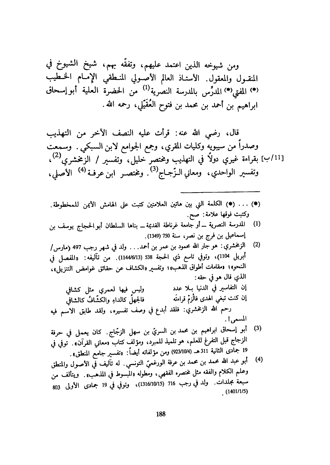 وَمن شُيُوخه الَّذين اعْتمد عَلَيْهِم وتفقه بهم شيخ الشُّيُوخ فِي الْمَنْقُول والمعقول الْأُسْتَاذ الْعَالم الأصولي المنقطي الإِمَام الْخَطِيب الْمُفْتِي الْمدرس بِالْمَدْرَسَةِ النصرية من الحضرة الْعلية أَبُو إِسْحَاق ابراهيم بن أَحْمد بن مُحَمَّد بن فتوح الْعقيلِيّ رَحمَه الله