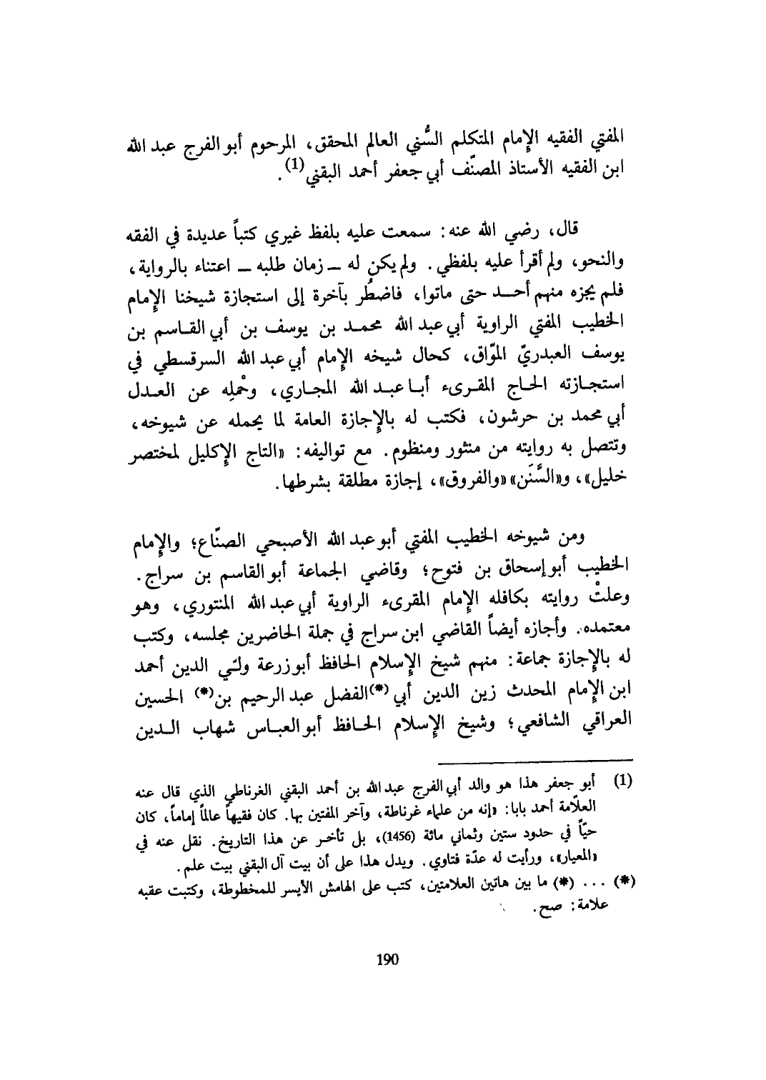 الْمُفْتِي الْفَقِيه الإِمَام الْمُتَكَلّم السّني الْعَالم الْمُحَقق المرحوم أَبُو الْفرج عبد الله ابْن الْفَقِيه الْأُسْتَاذ المُصَنّف أبي جَعْفَر أَحْمد البقني