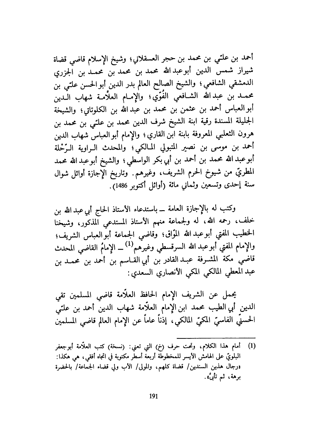 وَكتب لَهُ بِالْإِجَازَةِ الْعَامَّة باستدعاء الْأُسْتَاذ الْحَاج أبي عبد الله بن خلف رَحمَه الله لَهُ ولجماعة مِنْهُم الْأُسْتَاذ المستدعي الْمَذْكُور وَشَيخنَا الْخَطِيب الْمُفْتِي أَبُو عبد الله الْمواق وقاضي الْجَمَاعَة أَبُو الْعَبَّاس الشريف وَالْإِمَام الْمُفْتِي أَبُو عبد الله السَّرقسْطِي وَغَيرهم الإِمَام القَاضِي الْمُحدث قَاضِي مَكَّة المشرفة عبد الْقَادِر بن أبي الْقَاسِم بن أَحْمد بن مُحَمَّد بن عبد الْمُعْطِي الْمَالِكِي الْمَكِّيّ الْأنْصَارِيّ السَّعْدِيّ