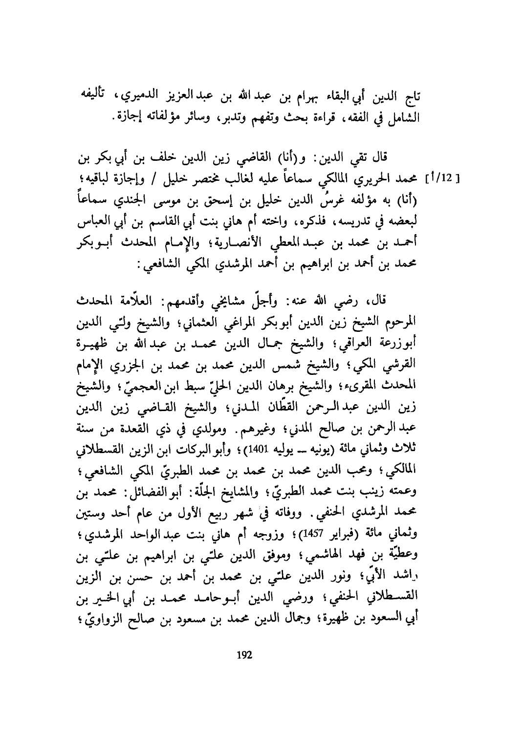 قَالَ رَضِي الله عَنهُ وَأجل مشايخي وأقدمهم الْعَلامَة الْمُحدث المرحوم الشَّيْخ زين الدّين أَبُو بكر المراغي العثماني وَالشَّيْخ ولي الدّين أَبُو زرْعَة الْعِرَاقِيّ وَالشَّيْخ جمال الدّين مُحَمَّد بن عبد الله بن ظهيرة الْقرشِي الْمَكِّيّ وَالشَّيْخ شمس الدّين مُحَمَّد بن مُحَمَّد بن الْجَزرِي الإِمَام الْمُحدث المقرىء وَالشَّيْخ برهَان الدّين الْحلِيّ سبط ابْن العجمي وَالشَّيْخ زين الدّين عبد الرَّحْمَن الْقطَّان الْمدنِي وَالشَّيْخ القَاضِي زين الدّين عبد الرَّحْمَن بن صَالح الْمدنِي وَغَيرهم ومولدي فِي ذِي الْقعدَة من سنة ثَلَاث وثماني مائَة يونيه يوليه 1401 وَأَبُو البركات ابْن الزين الْقُسْطَلَانِيّ الْمَالِكِي ومحب الدّين مُحَمَّد بن مُحَمَّد بن مُحَمَّد الطَّبَرِيّ الْمَكِّيّ الشَّافِعِي وَعَمَّته زَيْنَب بنت مُحَمَّد الطَّبَرِيّ والمشايخ الجلة أَبُو الْفَضَائِل مُحَمَّد بن مُحَمَّد المرشدي الْحَنَفِيّ ووفاته فِي شهر ربيع الأول من عَام أحد وَسِتِّينَ وثماني مائَة فبراير 1457 وزوجه أم هاني بنت عبد الْوَاحِد المرشدي وعطية بن فَهد الْهَاشِمِي وموفق الدّين عَليّ بن ابراهيم بن عَليّ بن رَاشد الأبي وَنور الدّين عَليّ بن مُحَمَّد بن أَحْمد بن حسن بن الزين الْقُسْطَلَانِيّ الْحَنَفِيّ وَرَضي الدّين أَبُو حَامِد مُحَمَّد بن أبي الْخَيْر بن أبي السُّعُود بن ظهيرة وجمال الدّين مُحَمَّد بن مَسْعُود بن صَالح الزواوي