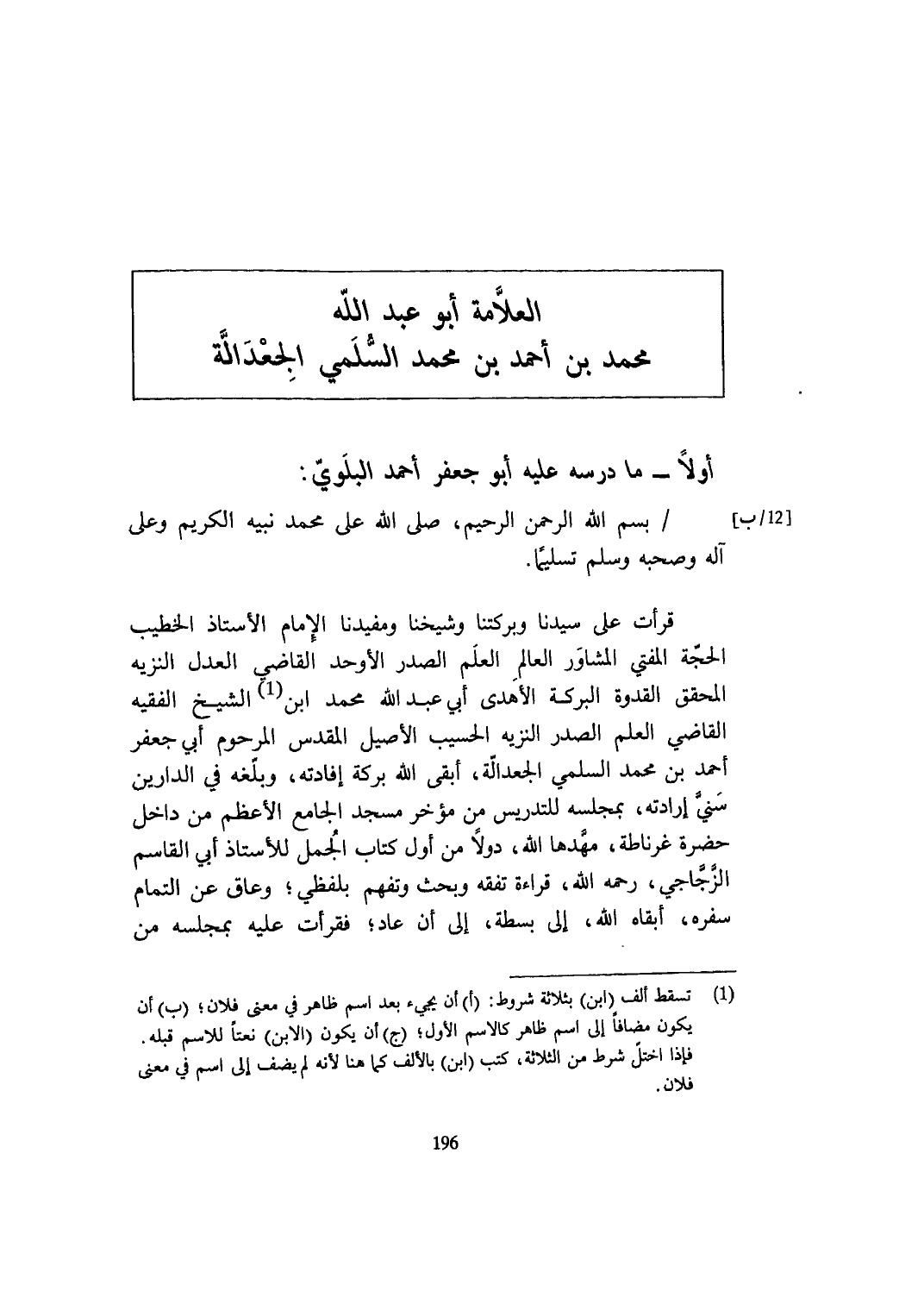 قَرَأت على سيدنَا وبركتنا وَشَيخنَا ومفيدنا الإِمَام الْأُسْتَاذ الْخَطِيب الْحجَّة الْمُفْتِي المشاور الْعَالم الْعلم الصَّدْر الأوحد القَاضِي الْعدْل النزيه الْمُحَقق الْقدْوَة الْبركَة الأهدى أبي عبد الله مُحَمَّد ابْن الشَّيْخ الْفَقِيه القَاضِي الْعلم الصَّدْر النزيه الحسيب الْأَصِيل الْمُقَدّس المرحوم أبي جَعْفَر أَحْمد بن مُحَمَّد السّلمِيّ الجعدالة أبقى الله بركَة إفادته وبلغه فِي الدَّاريْنِ سني إِرَادَته بمجلسه للتدريس من مُؤخر مَسْجِد الْجَامِع الْأَعْظَم من دَاخل حَضْرَة غرناطة مهدها الله دولا من أول كتاب الْجمل للأستاذ أبي الْقَاسِم الزجاجي رَحمَه الله قِرَاءَة تفقه وَبحث وتفهم بلفظي وعاق عَن التَّمام سَفَره أبقاه الله إِلَى بسطة إِلَى أَن عَاد فَقَرَأت عَلَيْهِ بمجلسه من