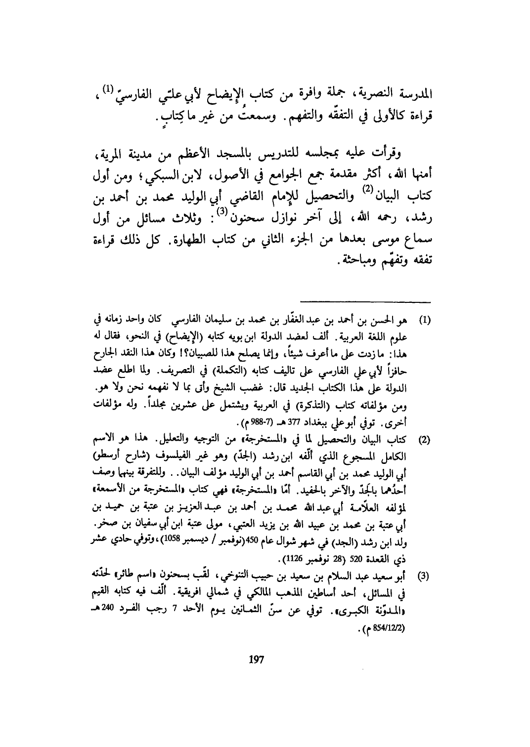 وقرأت عَلَيْهِ بمجلسه للتدريس بِالْمَسْجِدِ الْأَعْظَم من مَدِينَة المرية أمنها الله أَكثر مُقَدّمَة جمع الْجَوَامِع فِي الْأُصُول لِابْنِ السُّبْكِيّ وَمن أول كتاب الْبَيَان والتحصيل للْإِمَام القَاضِي أبي الْوَلِيد مُحَمَّد بن أَحْمد بن رشد رَحمَه الله إِلَى آخر نَوَازِل سَحْنُون وَثَلَاث مسَائِل من أول سَماع مُوسَى بعْدهَا من الْجُزْء الثَّانِي من كتاب الطَّهَارَة كل ذَلِك قِرَاءَة تفقه وتفهم ومباحثة
