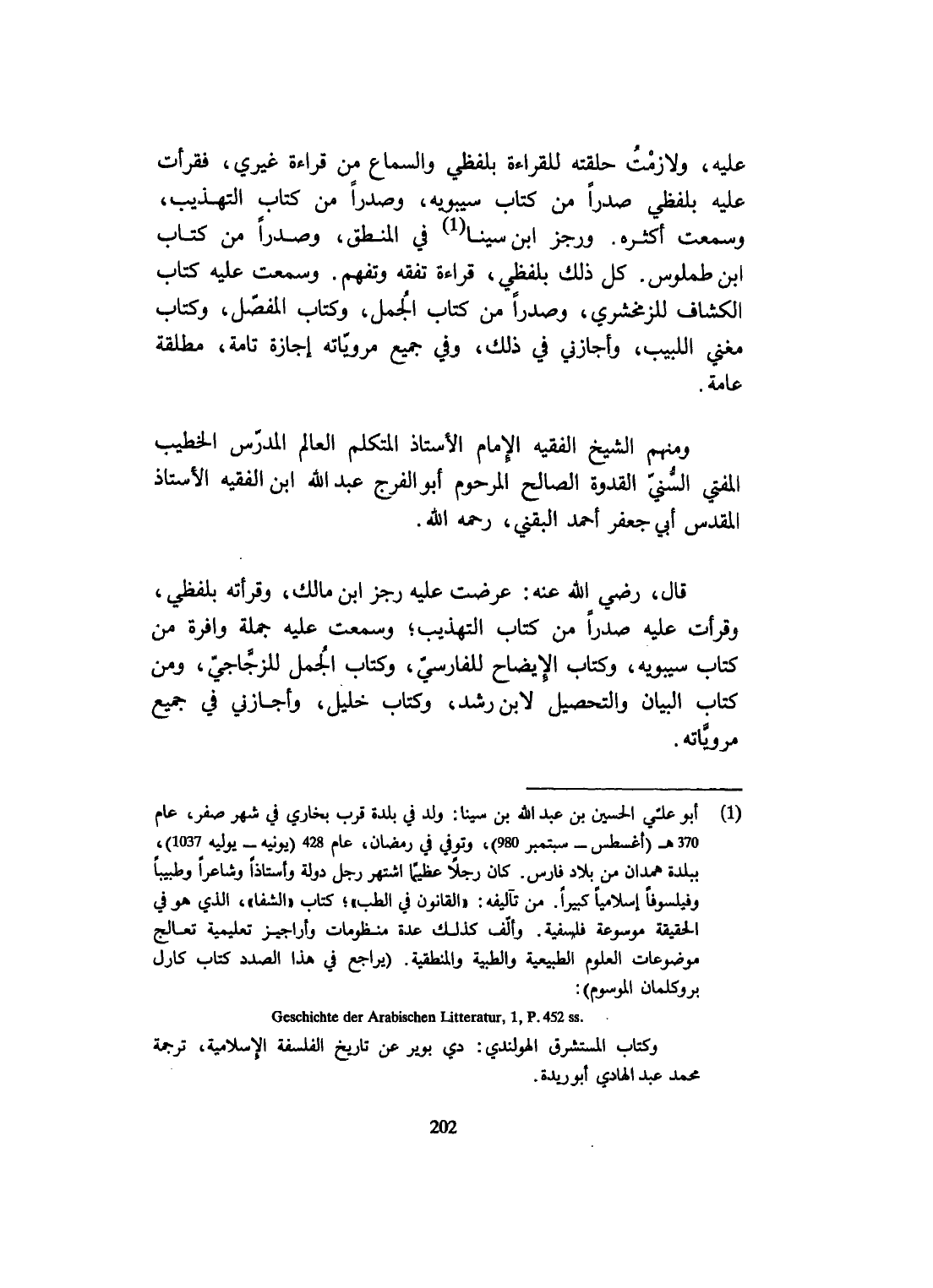 عَلَيْهِ ولازمت حلقته للْقِرَاءَة بلفظي وَالسَّمَاع من قِرَاءَة غَيْرِي فَقَرَأت عَلَيْهِ بلفظي صَدرا من كتاب سِيبَوَيْهٍ وصدرا من كتاب التَّهْذِيب وَسمعت أَكْثَره ورجز ابْن سينا فِي الْمنطق وصدرا من كتاب ابْن طملوس كل ذَلِك بلفظي قِرَاءَة تفقه وتفهم وَسمعت عَلَيْهِ كتاب الْكَشَّاف للزمخشري وصدرا من كتاب الْجمل وَكتاب الْمفصل وَكتاب مُغنِي اللبيب وأجازني فِي ذَلِك وَفِي جَمِيع مروياته إجَازَة تَامَّة مُطلقَة عَامَّة