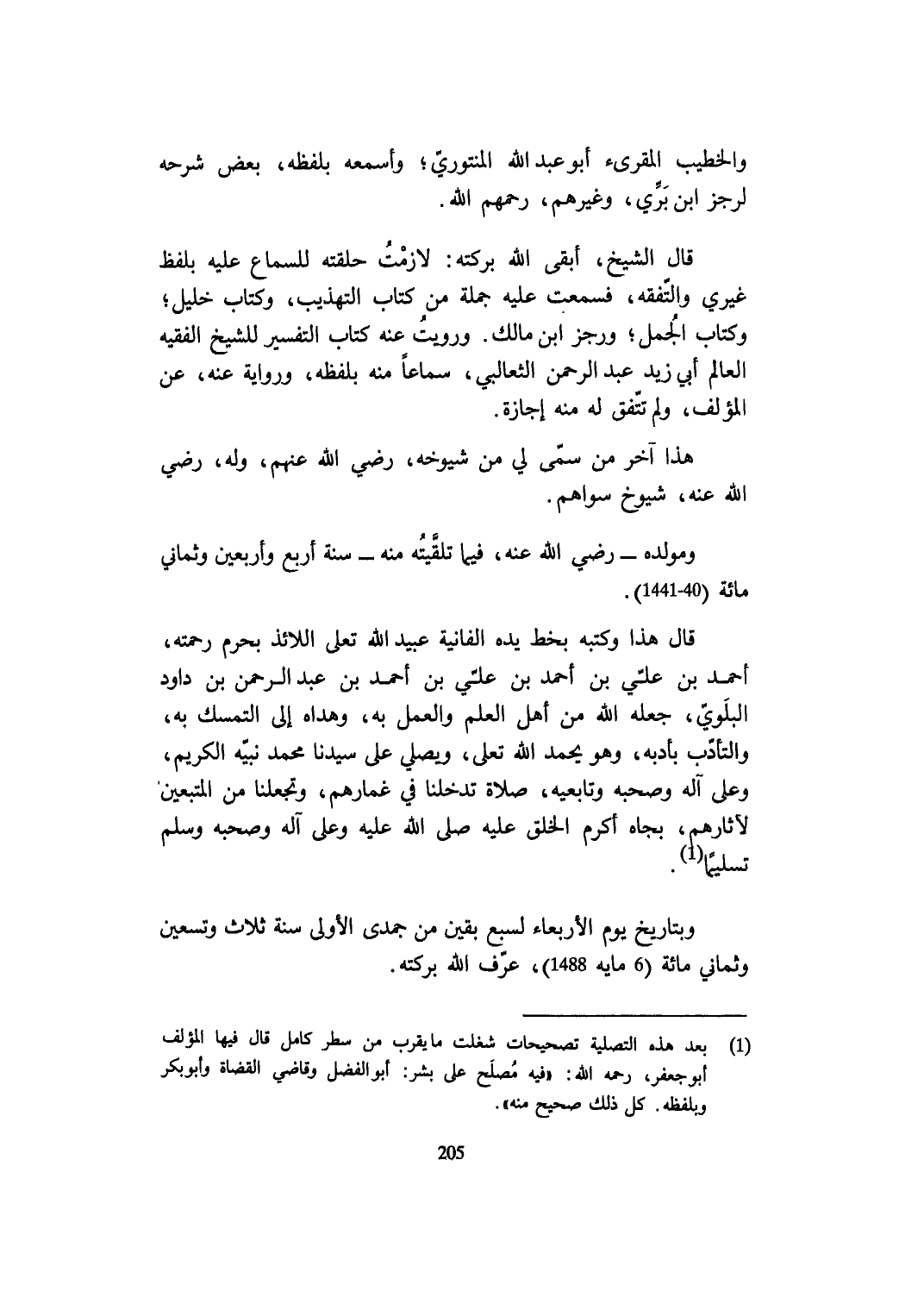 قَالَ هَذَا وَكتبه بِخَط يَده الفانية عبيد الله تعلى اللائذ بحرم رَحمته أَحْمد بن عَليّ بن أَحْمد بن عَليّ بن أَحْمد بن عبد الرَّحْمَن بن دَاوُد البلوي جعله الله من أهل الْعلم وَالْعَمَل بِهِ وهداه إِلَى التَّمَسُّك بِهِ والتأدب بأدبه وَهُوَ يحمد الله تعلى وَيُصلي على سيدنَا مُحَمَّد نبيه الْكَرِيم وعَلى آله وَصَحبه وتابعيه وَصَلَاة تُدْخِلنَا فِي غمارهم وتجعلنا من المتبعين لآثارهم بجاه أكْرم الْخلق عَلَيْهِ صلى الله عَلَيْهِ وعَلى آله وَصَحبه وَسلم تَسْلِيمًا