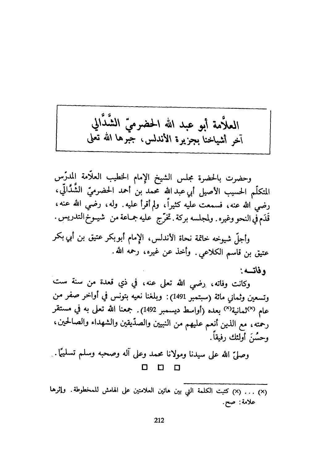 الْعَلامَة أَبُو عبد الله الْحَضْرَمِيّ الشدالي آخر أشياخنا بِجَزِيرَة الأندلس جبرها الله تعلى