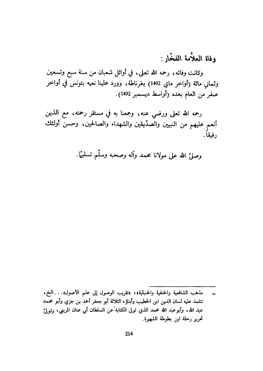 وَكَانَت وَفَاته رَحمَه الله تعلى فِي أَوَائِل شعْبَان من سنة سبع وَتِسْعين وثماني مائَة أَوَاخِر ماي 1492 بغرناطة وَورد علينا نعيه بتونس فِي أَوَاخِر صفر من الْعَام بعده أواسط ديسمبر 1492