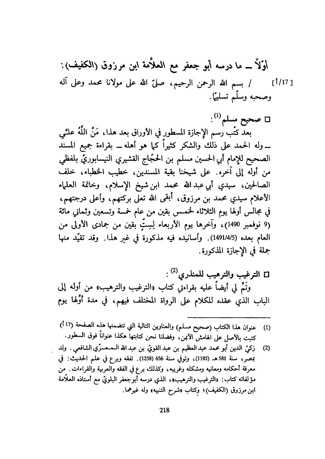 بعد كتب رسم الْإِجَازَة المسطور فِي الأوراق بعد هَذَا من الله عَليّ وَله الْحَمد على ذَلِك وَالشُّكْر كثيرا كَمَا هُوَ أَهله بِقِرَاءَة جَمِيع الْمسند الصَّحِيح للْإِمَام أبي الْحُسَيْن مُسلم بن الْحجَّاج الْقشيرِي النَّيْسَابُورِي بلفظي من أَوله إِلَى آخِره على شَيخنَا بَقِيَّة المسندين خطيب الخطباء خلف الصَّالِحين سَيِّدي أبي عبد الله مُحَمَّد ابْن شيخ الْإِسْلَام وخاتمه الْعلمَاء الْأَعْلَام سَيِّدي مُحَمَّد بن مَرْزُوق أبقى الله تعلى بركتهم وَأَعْلَى درجتهم فِي مجَالِس أَولهَا يَوْم الثُّلَاثَاء لخمس بَقينَ من عَام خَمْسَة وَتِسْعين وثماني مائَة 9 نوفمبر 1490 وَآخِرهَا يَوْم الْأَرْبَعَاء لست بَقينَ من جُمَادَى الأولى من الْعَام بعده (1491 / 4 / 5) وَأَسَانِيده فِيهِ مَذْكُورَة فِي غير هَذَا وَقد تقيد مِنْهَا جملَة فِي الْإِجَازَة الْمَذْكُورَة