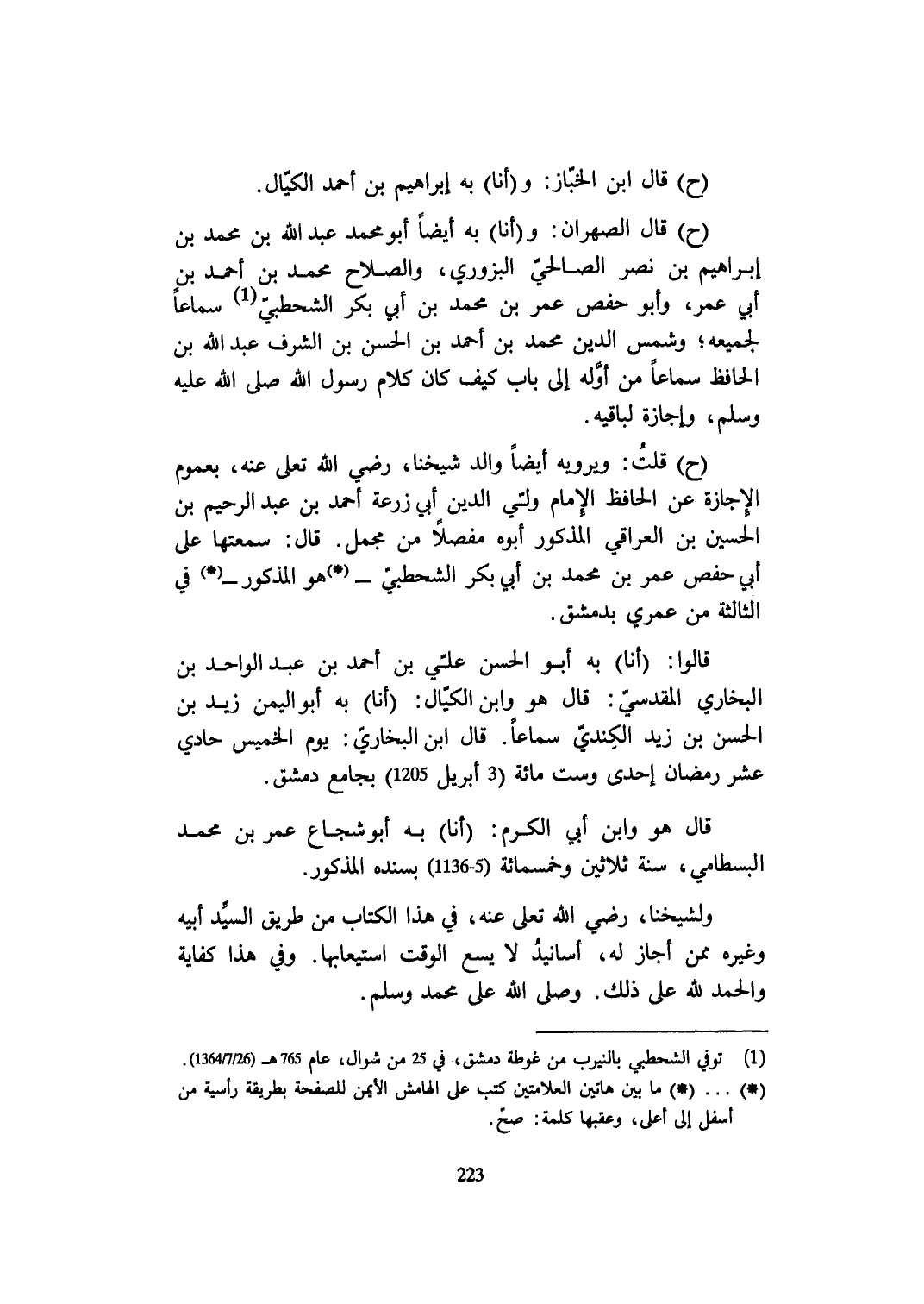 ح قَالَ الصهران وَأَنا بِهِ أَيْضا أَبُو مُحَمَّد عبد الله بن مُحَمَّد بن إِبْرَاهِيم بن نصر الصَّالِحِي الْبزورِي وَالصَّلَاح مُحَمَّد بن أَحْمد بن أبي عمر وَأَبُو حَفْص عمر بن مُحَمَّد بن أبي بكر الشحطبي سَمَاعا لجميعه وشمس الدّين مُحَمَّد بن أَحْمد بن الْحسن بن الشّرف عبد الله بن الْحَافِظ سَمَاعا من أَوله إِلَى بَاب كَيفَ كَانَ كَلَام رَسُول الله صلى الله عَلَيْهِ وَسلم وإجازة لباقيه