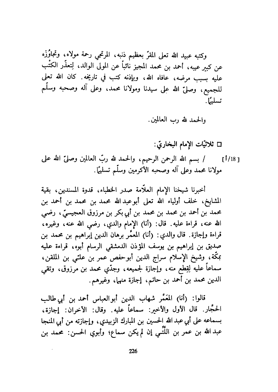 أخبرنَا شَيخنَا الإِمَام الْعَلامَة صدر الخطباء قدوة المسندين بَقِيَّة الْمَشَايِخ خلف أَوْلِيَاء الله تعلى أَبُو عبد الله مُحَمَّد بن مُحَمَّد بن أَحْمد بن مُحَمَّد بن أَحْمد بن مُحَمَّد بن مُحَمَّد بن أبي بكر بن مَرْزُوق العجيسي رَضِي الله عَنهُ قِرَاءَة عَلَيْهِ قَالَ أَنا الإِمَام وَالِدي رَضِي الله عَنهُ وَغَيره قِرَاءَة وإجازة قَالَ وَالِدي أَنا المعمر برهَان الدّين إِبْرَاهِيم بن مُحَمَّد بن صديق بن إِبْرَاهِيم بن يُوسُف الْمُؤَذّن الدِّمَشْقِي الرسام أَبوهُ قِرَاءَة عَلَيْهِ بِمَكَّة وَشَيخ الْإِسْلَام سراج الدّين أَبُو حَفْص عمر بن عَليّ بن الملقن سَمَاعا عَلَيْهِ لقطع مِنْهُ وإجازة لجميعه وجدي مُحَمَّد بن مَرْزُوق وتقي الدّين مُحَمَّد بن أَحْمد بن حَاتِم إجَازَة مِنْهُمَا وَغَيرهم