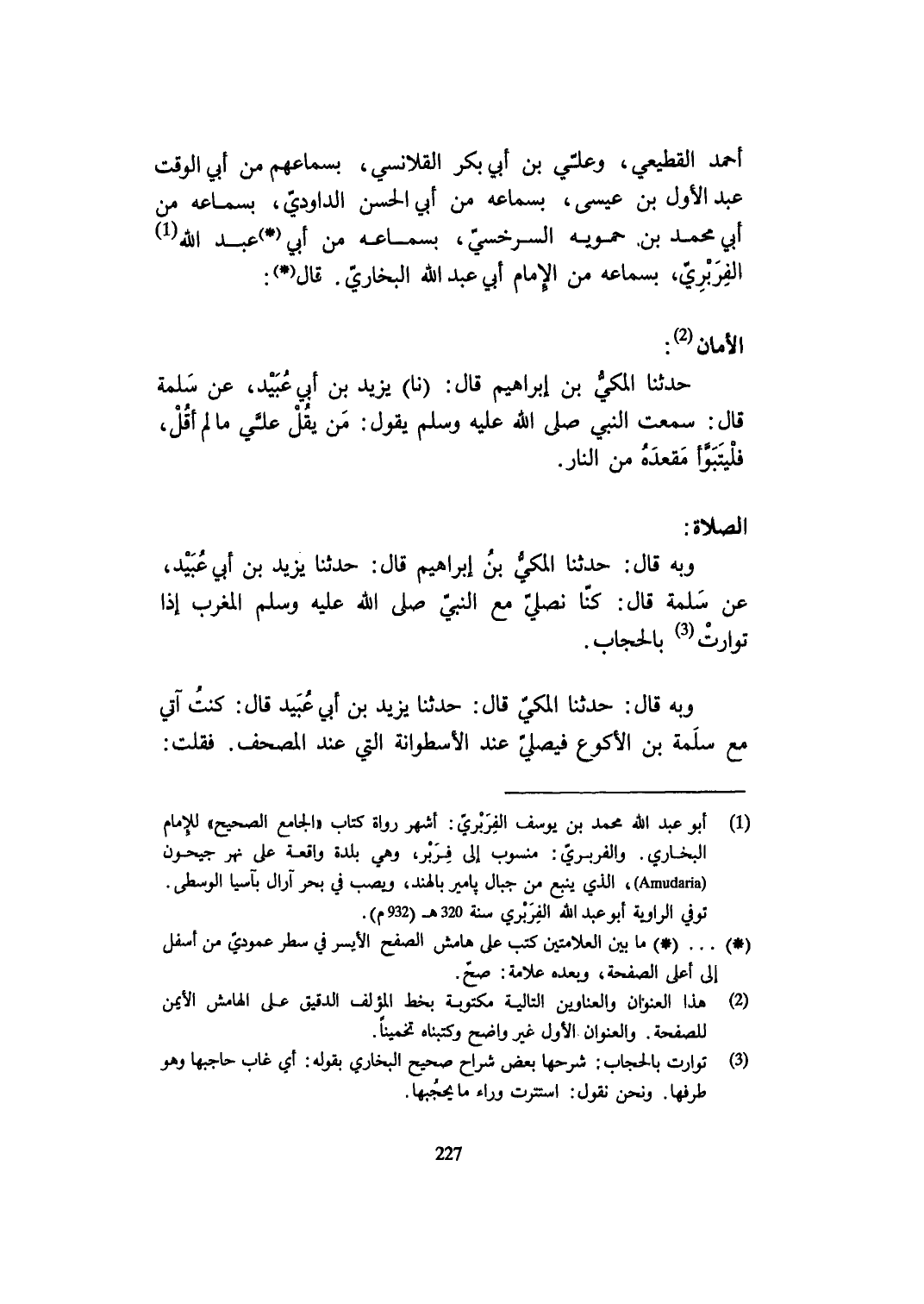 أَحْمد الْقطيعِي وَعلي بن أبي بكر القلانسي بسماعهم من أبي الْوَقْت عبد الأول بن عِيسَى بِسَمَاعِهِ من أبي الْحسن الداوري بِسَمَاعِهِ من أبي مُحَمَّد بن حمويه السَّرخسِيّ بِسَمَاعِهِ من أبي عبد الله الْفربرِي بِسَمَاعِهِ من الإِمَام أبي عبد الله البُخَارِيّ قَالَ