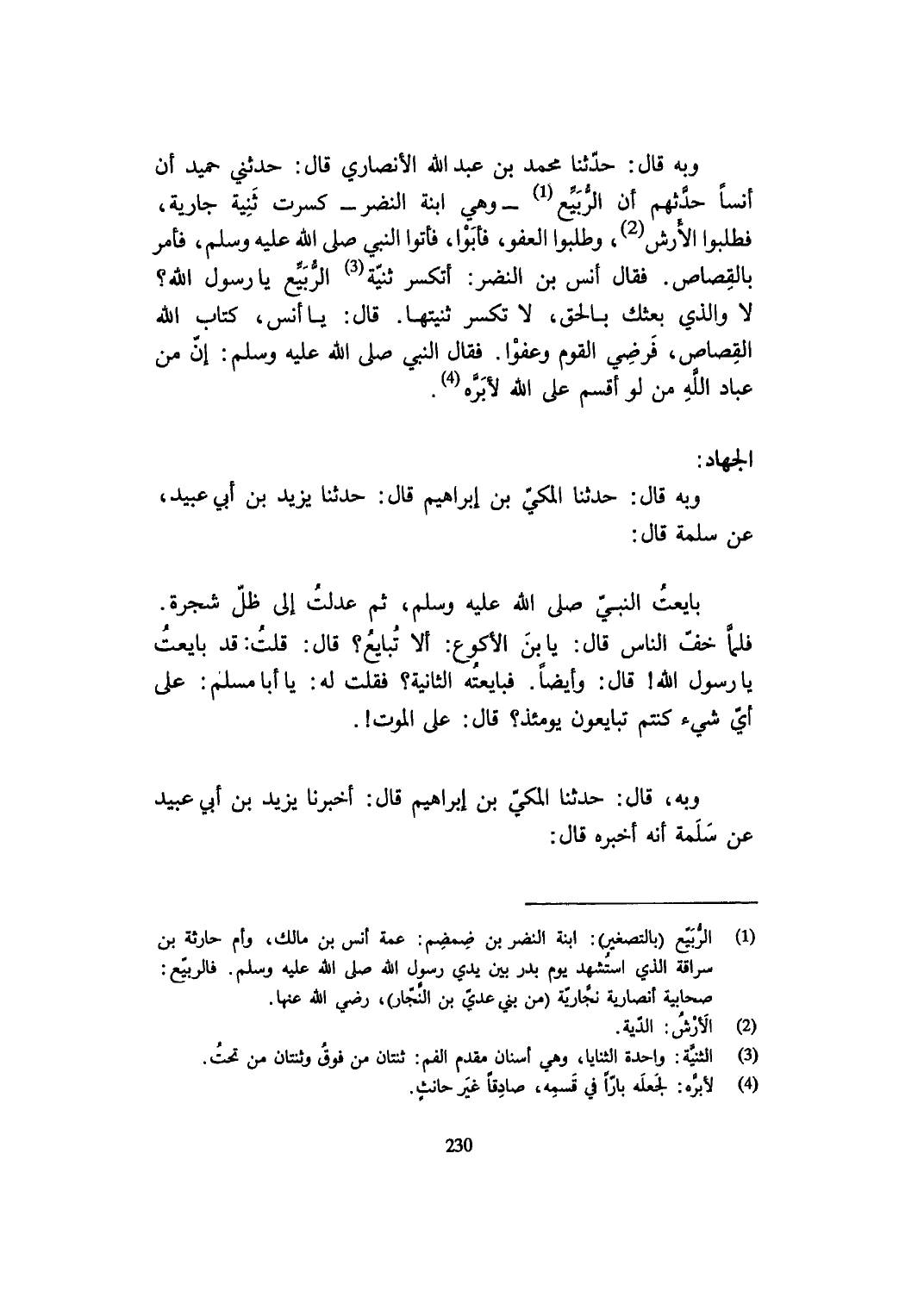 وَبِه قَالَ حَدثنَا مُحَمَّد بن عبد الله الْأنْصَارِيّ قَالَ حَدثنِي حميد أَن أنسا حَدثهمْ أَن الرّبيع وَهِي ابْنة النَّضر كسرت ثنية جَارِيَة فطلبوا الْأَرْش وطلبوا الْعَفو فَأَبَوا فَأتوا النَّبِي صلى الله عَلَيْهِ وَسلم فَأمر بِالْقصاصِ فَقَالَ أنس بن النَّضر أتكسر ثنية الرّبيع يَا رَسُول الله لَا وَالَّذِي بَعثك بِالْحَقِّ لَا تكسر ثنيتها قَالَ يَا أنس كتاب الله الْقصاص فَرضِي الْقَوْم وعفوا فَقَالَ النَّبِي صلى الله عَلَيْهِ وَسلم إِن من عباد الله من لَو أقسم على الله لَأَبَره