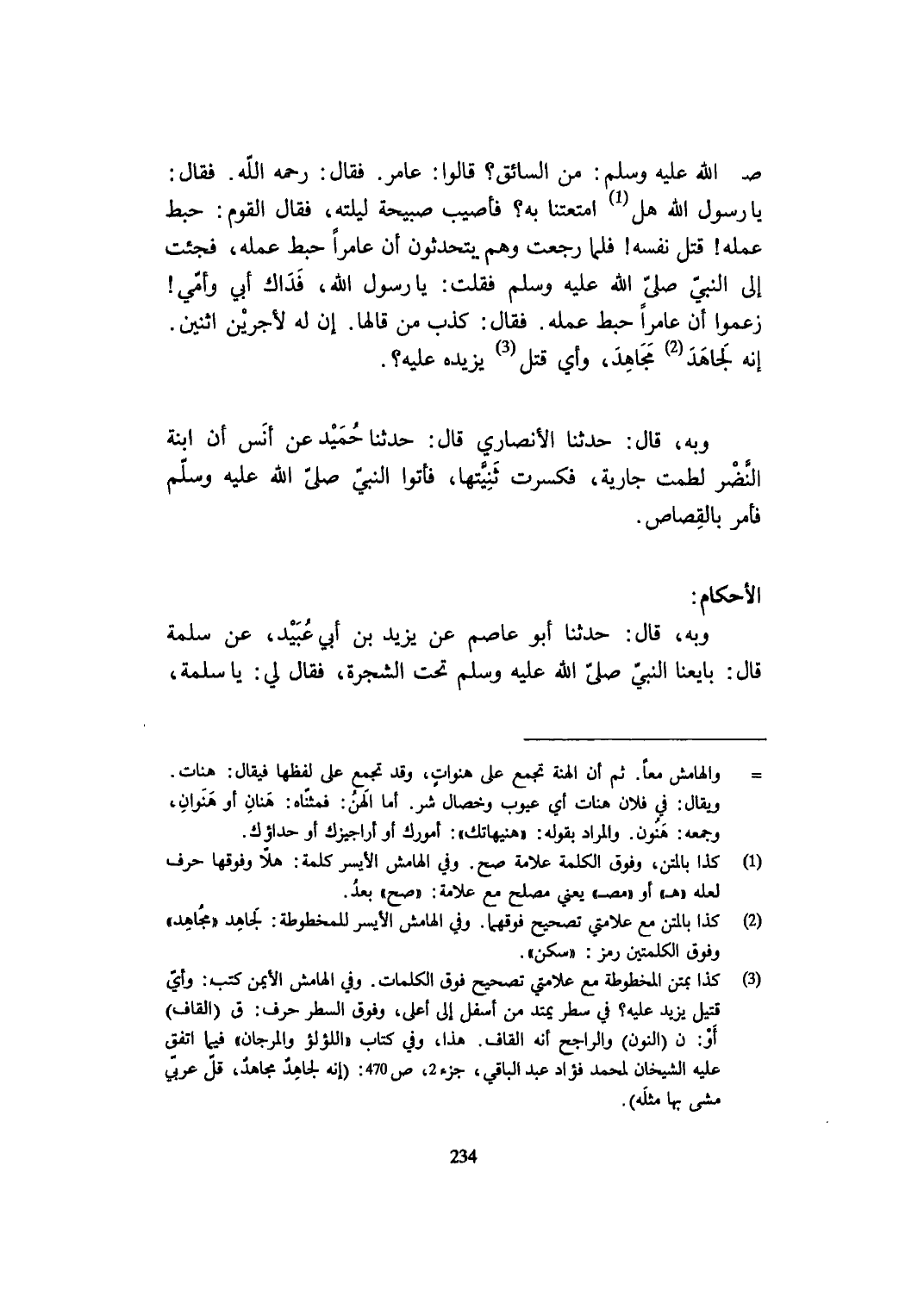 صلى الله عَلَيْهِ وَسلم من السَّائِق قَالُوا عَامر فَقَالَ رَحمَه الله فَقَالَ يَا رَسُول الله هَل امتعتنا بِهِ فأصيب صَبِيحَة ليلته فَقَالَ الْقَوْم حَبط عمله قتل نَفسه فَلَمَّا رجعت وهم يتحدثون أَن عَامِرًا حَبط عمله فَجئْت إِلَى النَّبِي صلى الله عَلَيْهِ وَسلم فَقلت يَا رَسُول الله فدَاك أبي وَأمي زَعَمُوا أَن عَامِرًا حَبط عمله فَقَالَ كذب من قَالَهَا إِن لَهُ لأجرين اثْنَيْنِ إِنَّه لجاهد مُجَاهِد وَأي قتل يزِيدهُ عَلَيْهِ