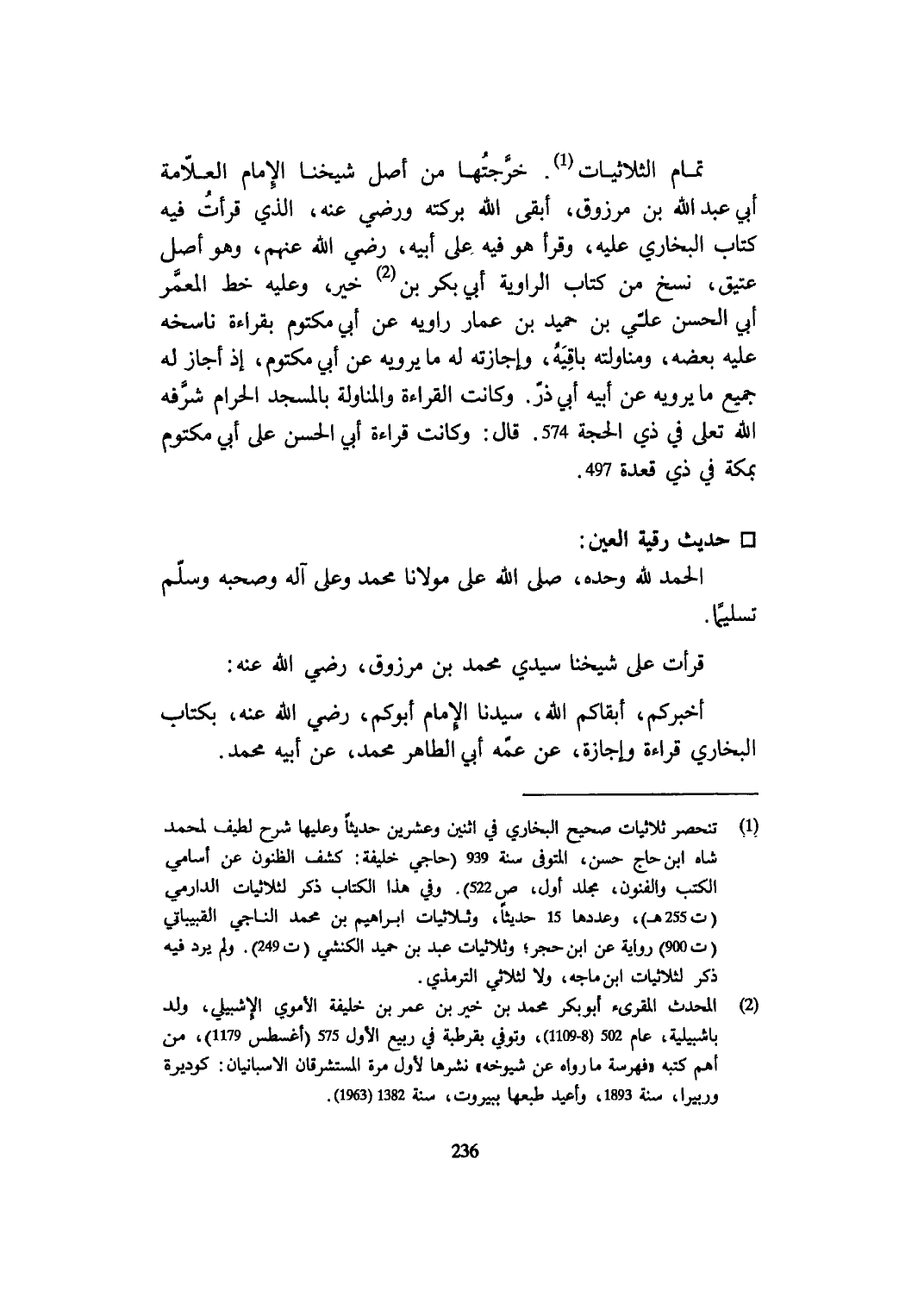 تَمام الثلاثيات خرجتها من أصل شَيخنَا الإِمَام الْعَلامَة أبي عبد الله بن مَرْزُوق أبقى الله بركته وَرَضي عَنهُ الَّذِي قَرَأت فِيهِ كتاب البُخَارِيّ عَلَيْهِ وَقَرَأَ هُوَ فِيهِ على أَبِيه رَضِي الله عَنْهُم وَهُوَ أصل عَتيق نسخ من كتاب الراوية أبي بكر بن خير وَعَلِيهِ خطّ المعمر أبي الْحسن عَليّ بن حميد بن عمار رَاوِيه عَن أبي مَكْتُوم بِقِرَاءَة ناسخه عَلَيْهِ بعضه ومناولته بَاقِيه وإجازته لَهُ مايرويه عَن أبي مَكْتُوم إِذا أجَاز لَهُ جَمِيع مَا يرويهِ عَن أَبِيه أبي ذَر وَكَانَت الْقِرَاءَة والمناولة بِالْمَسْجِدِ الْحَرَام شرفه الله تعلى فِي ذِي الْحجَّة 574 قَالَ وَكَانَت قِرَاءَة أبي الْحسن على أبي مَكْتُوم بِمَكَّة فِي ذِي قعدة 497