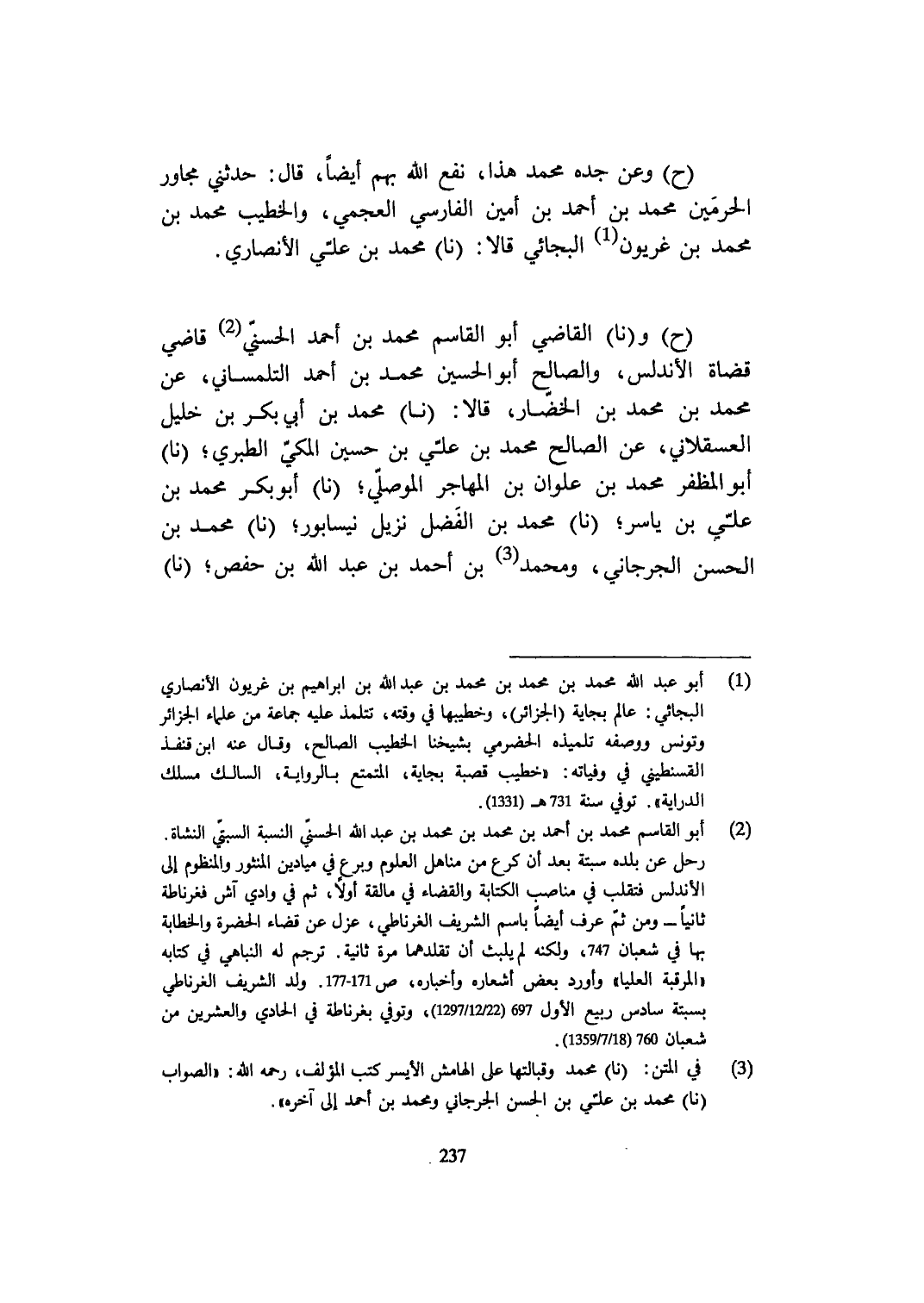 ح وَعَن جده مُحَمَّد هَذَا نفع الله بهم أَيْضا قَالَ حَدثنِي مجاور الْحَرَمَيْنِ مُحَمَّد بن أَحْمد بن أَمِين الْفَارِسِي العجمي والخطيب مُحَمَّد بن مُحَمَّد بن غريون البجائي قَالَا نَا مُحَمَّد بن عَليّ الْأنْصَارِيّ
