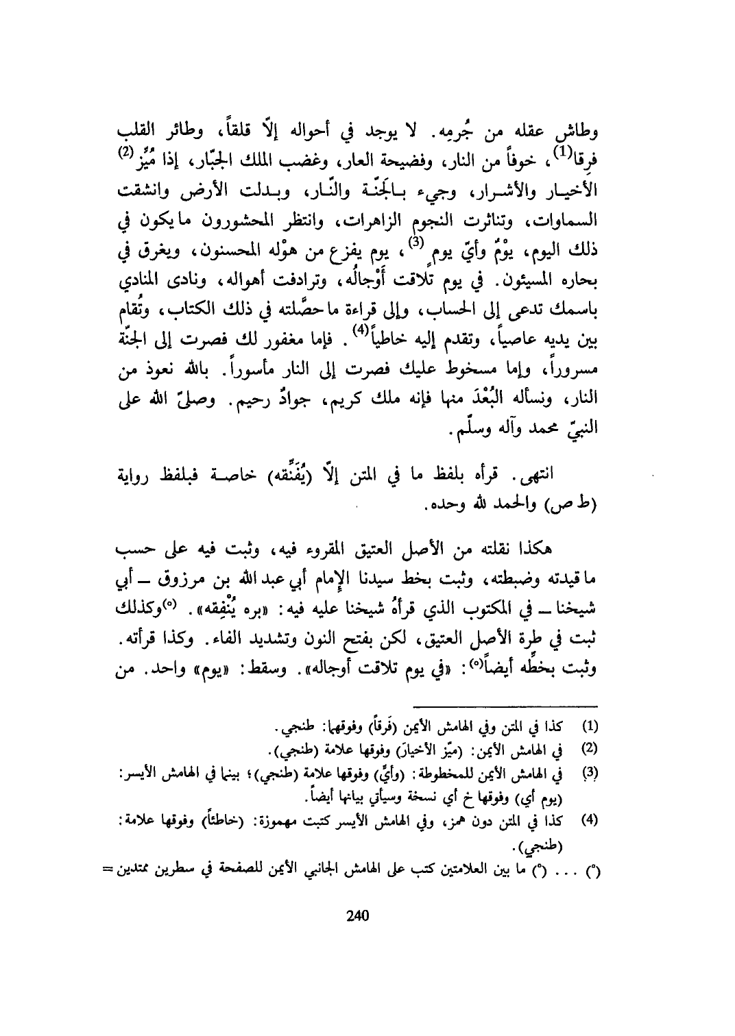 وطاش عقله من جرمه لَا يُوجد فِي أَحْوَاله إِلَّا قلقا وطائر الْقلب فرقا خوفًا من النَّار وفضيحة الْعَار وَغَضب الْملك الْجَبَّار إِذا ميز الأخيار والأشرار وَجِيء بِالْجنَّةِ وَالنَّار وبدلت الأَرْض وانشقت السَّمَاوَات وتناثرت النُّجُوم الزاهرات وانتظر المحشورون مَا يكون فِي ذَلِك الْيَوْم يَوْم وَأي يَوْم يَوْم بفزع من هوله المحسنون ويغرق فِي بحاره المسيئون فِي يَوْم تلاقت أوجاله وترادفت أهواله ونادى الْمُنَادِي بِاسْمِك تدعى إِلَى الْحساب وَإِلَى قِرَاءَة مَا حصلته فِي ذَلِك الْكتاب وتقام بَين يَدَيْهِ عَاصِيا وَتقدم إِلَيْهِ خاطيا فإمَّا مغْفُور لَك فصرت إِلَى الْجنَّة مَسْرُورا وَإِمَّا مسخوط عَلَيْك فصرت إِلَى النَّار مأسورا بِاللَّه نَعُوذ من النَّار ونسأله الْبعد مِنْهَا فَإِنَّهُ ملك كريم جواد رَحِيم وَصلى الله على النَّبِي مُحَمَّد وَآله وَسلم