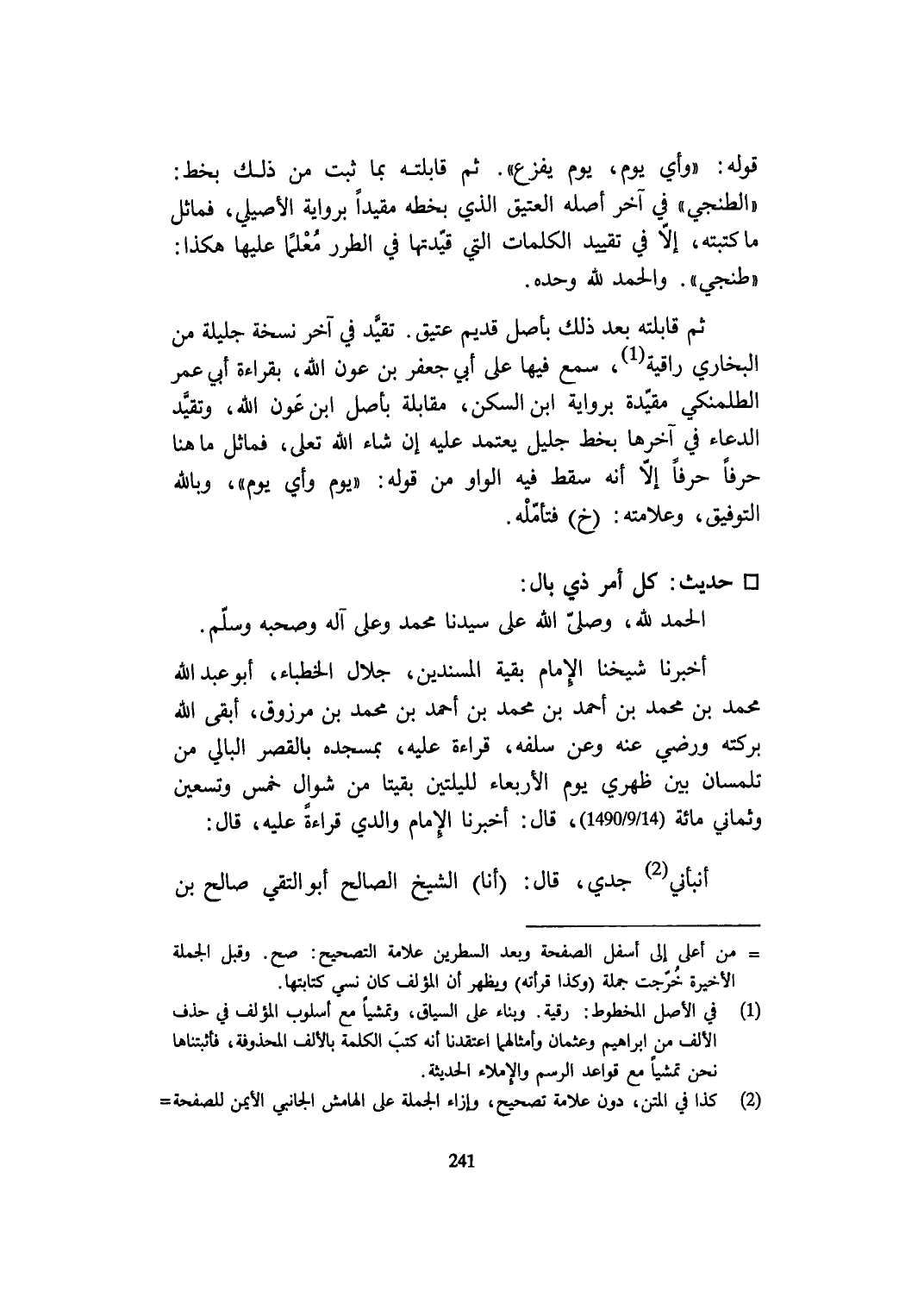 ثمَّ قابلته بعد ذَلِك بِأَصْل قديم عَتيق تقيد فِي آخر نُسْخَة جليلة من البُخَارِيّ راقية سمع فِيهَا على أبي جَعْفَر بن عون الله بِقِرَاءَة أبي عمر الطلمنكي مُقَيّدَة بِرِوَايَة ابْن السكن مُقَابلَة بِأَصْل ابْن عون الله وتقيد الدُّعَاء فِي آخرهَا بِخَط جليل يعْتَمد عَلَيْهِ إِن شَاءَ الله تعلى فماثل مَا هُنَا حرفا حرفا إِلَّا أَنه سقط فِيهِ الْوَاو من قَوْله يَوْم وَأي يَوْم وَبِاللَّهِ التَّوْفِيق وعلامته خَ فَتَأَمّله