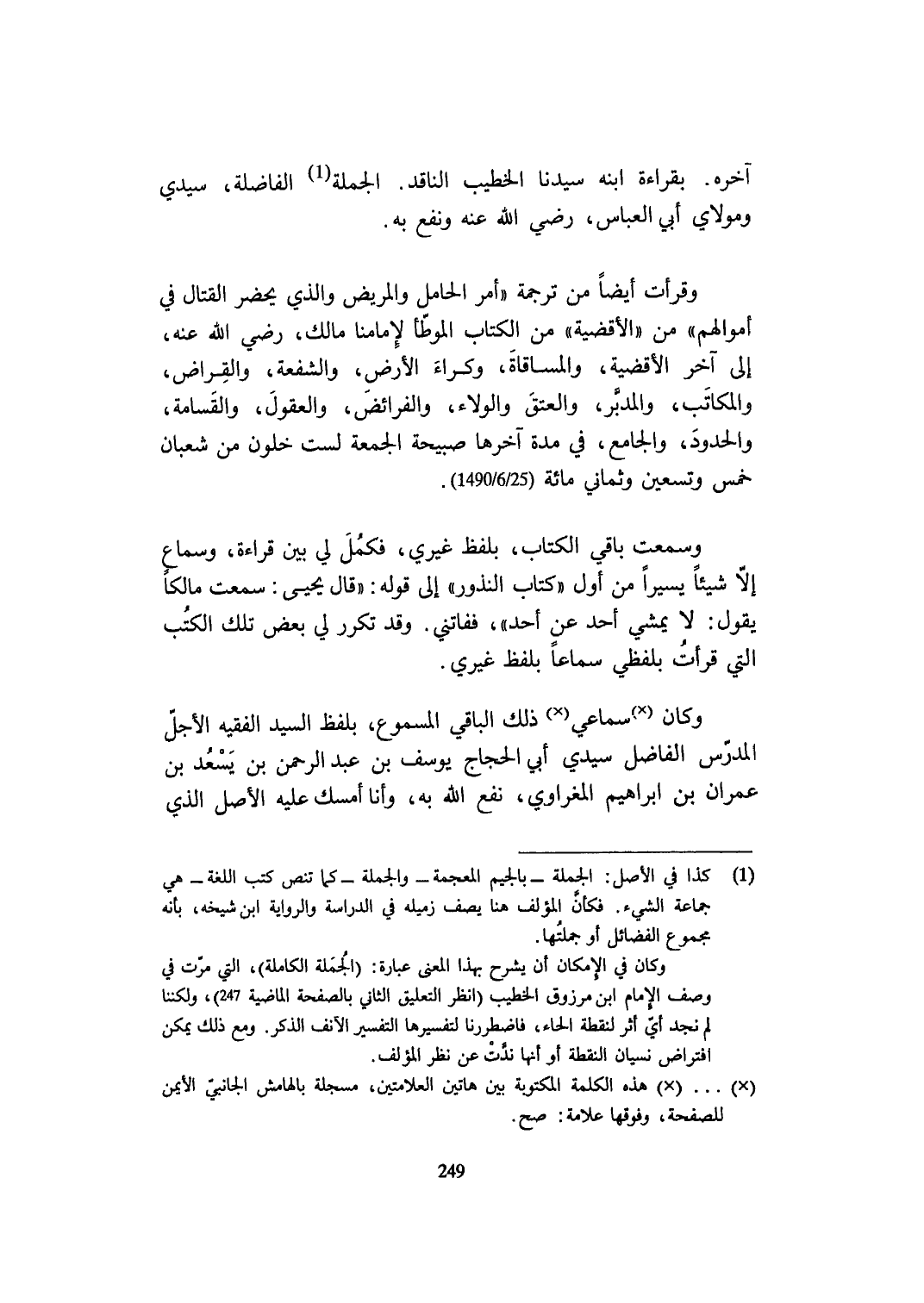 وَكَانَ سَمَاعي ذَلِك الْبَاقِي المسموع بِلَفْظ السَّيِّد الْفَقِيه الْأَجَل الْمدرس الْفَاضِل سَيِّدي أبي الْحجَّاج يُوسُف بن عبد الرَّحْمَن بن يسْعد بن عمرَان بن ابراهيم المغراوي نفع الله بِهِ وَأَنا أمسك عَلَيْهِ الأَصْل الَّذِي