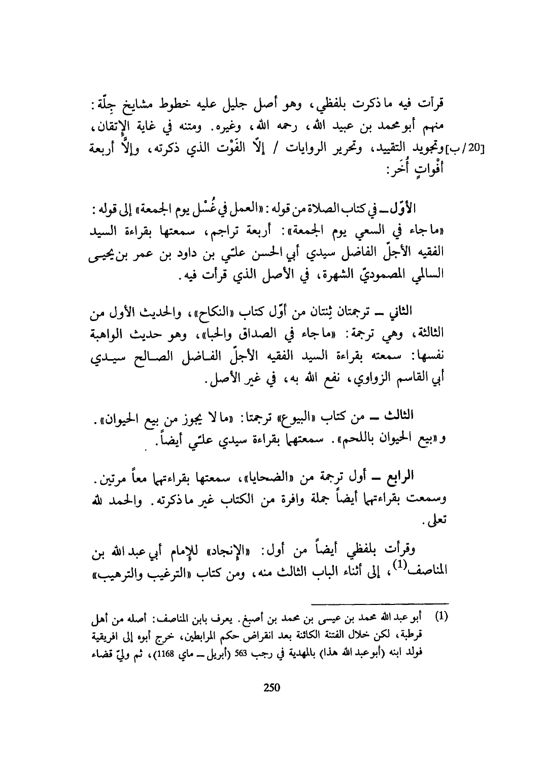 وقرأت بلفظي أَيْضا من أول الإنجاد للْإِمَام أبي عبد الله بن المناصف إِلَى أثْنَاء الْبَاب الثَّالِث مِنْهُ وَمن كتاب التَّرْغِيب والترهيب