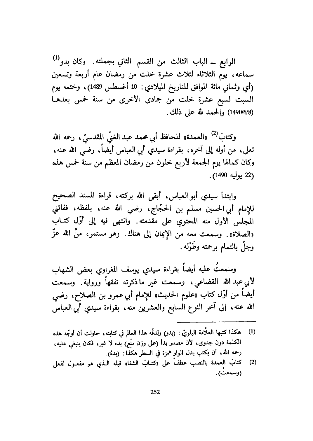الرَّابِع الْبَاب الثَّالِث من الْقسم الثَّانِي بجملته وَكَانَ بَدو سَمَاعه يَوْم الثُّلَاثَاء لثلاث عشرَة خلت من رَمَضَان عَام أَرْبَعَة وَتِسْعين أَي وثماني مائَة الْمُوَافق للتاريخ الميلادي 10 أغسطس 1489 وختمه يَوْم السبت لسبع عشرَة خلت من جُمَادَى الْأُخْرَى من سنة خمس بعْدهَا (1490 / 6 / 8) وَالْحَمْد لله على ذَلِك