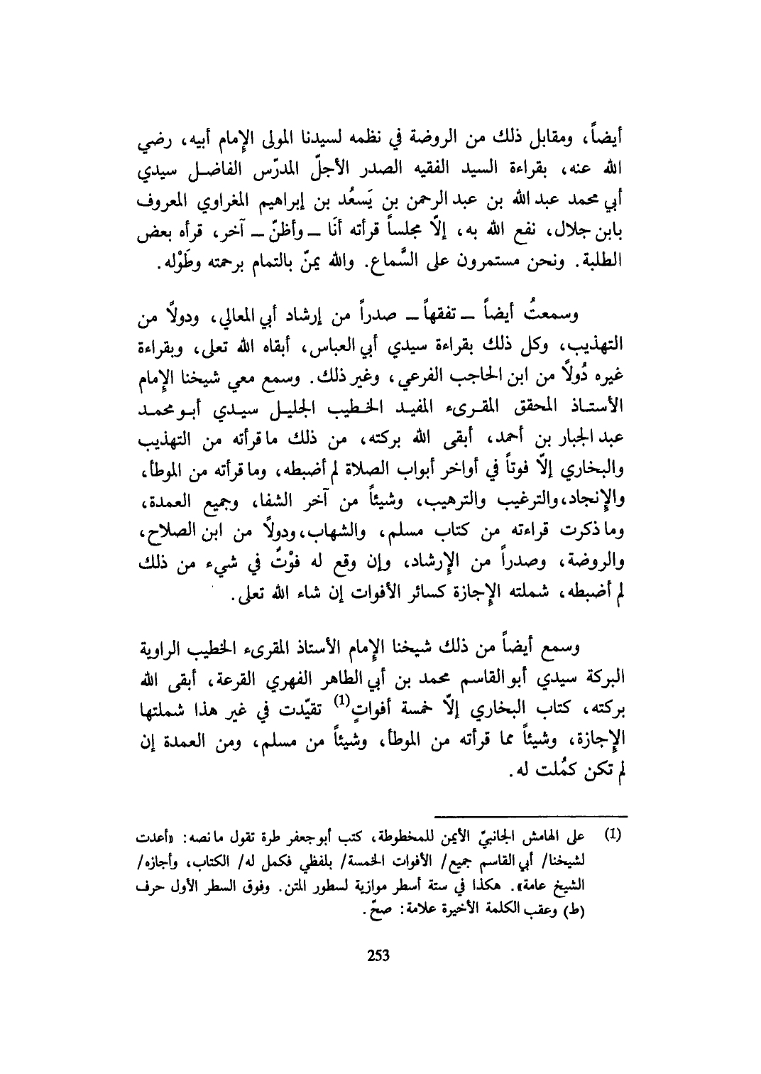وَسمعت أَيْضا تفقها صَدرا من إرشاد أبي الْمَعَالِي ودولا من التَّهْذِيب وكل ذَلِك بِقِرَاءَة سَيِّدي أبي الْعَبَّاس أبقاه الله تعلى وبقراءة غَيره دولا من ابْن الْحَاجِب الفرعي وَغير ذَلِك وَسمع معي شَيخنَا الإِمَام الْأُسْتَاذ الْمُحَقق المقرىء الْمُفِيد الْخَطِيب الْجَلِيل سَيِّدي أَبُو مُحَمَّد عبد الْجَبَّار بن أَحْمد أبقى الله بركته من ذَلِك مَا قرأته من التَّهْذِيب وَالْبُخَارِيّ إِلَّا فوتا فِي أَوَاخِر أَبْوَاب الصَّلَاة لم أضبطه وَمَا قرأته من الْمُوَطَّأ والإنجاد وَالتَّرْغِيب والترهيب وشيئا من آخر الشفا وَجَمِيع الْعُمْدَة وَمَا ذكرت قِرَاءَته من كتاب مُسلم والشهاب ودولا من ابْن الصّلاح وَالرَّوْضَة وصدرا من الْإِرْشَاد وَإِن وَقع لَهُ فَوت فِي شَيْء من ذَلِك لم أضبطه شملته الْإِجَازَة كَسَائِر الأفوات إِن شَاءَ الله تعلى
