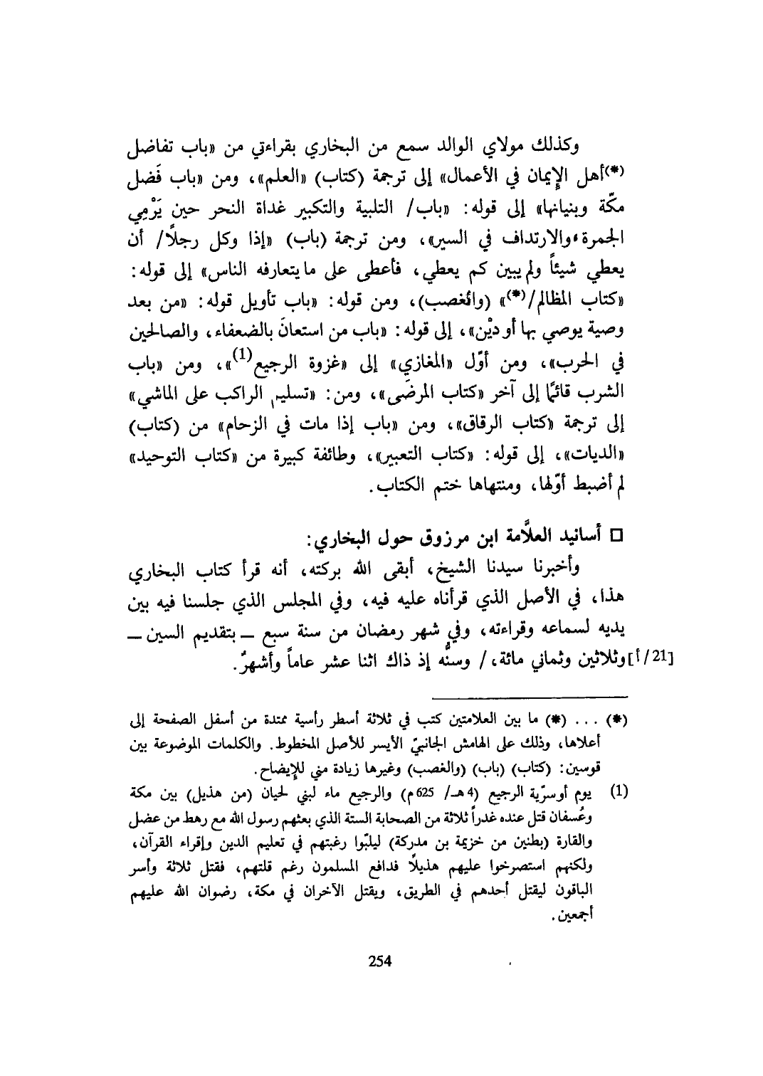 وَكَذَلِكَ مولَايَ الْوَالِد سمع من البُخَارِيّ بِقِرَاءَتِي من بَاب تفاضل أهل الْإِيمَان فِي الْأَعْمَال إِلَى تَرْجَمَة كتاب الْعلم وَمن بَاب فضل مَكَّة وبنيانها إِلَى قَوْله بَاب التَّلْبِيَة وَالتَّكْبِير غَدَاة النَّحْر حِين يَرْمِي الْجَمْرَة والارتداف فِي السّير وَمن تَرْجَمَة بَاب إِذا وكل رجلا أَن يُعْطي شَيْئا وَلم يبين كم يُعْطي فَأعْطى على مَا يتعارفه النَّاس إِلَى قَوْله كتاب الْمَظَالِم وَالْغَصْب وَمن قَوْله بَاب تَأْوِيل قَوْله من بعد وَصِيَّة يُوصي بهَا أَو دين إِلَى قَوْله بَاب من اسْتَعَانَ بالضعفاء وَالصَّالِحِينَ فِي الْحَرْب وَمن أول الْمَغَازِي إِلَى غَزْوَة الرجيع وَمن بَاب الشّرْب قَائِما إِلَى آخر كتاب المرضى وَمن تَسْلِيم الرَّاكِب على الْمَاشِي إِلَى تَرْجَمَة كتاب الرقَاق وَمن بَاب إِذا مَاتَ فِي الزحام من كتاب الدِّيات إِلَى قَوْله كتاب التَّعْبِير وَطَائِفَة كَبِيرَة من كتاب التَّوْحِيد لم أضبط أَولهَا ومنتهاها ختم الْكتاب