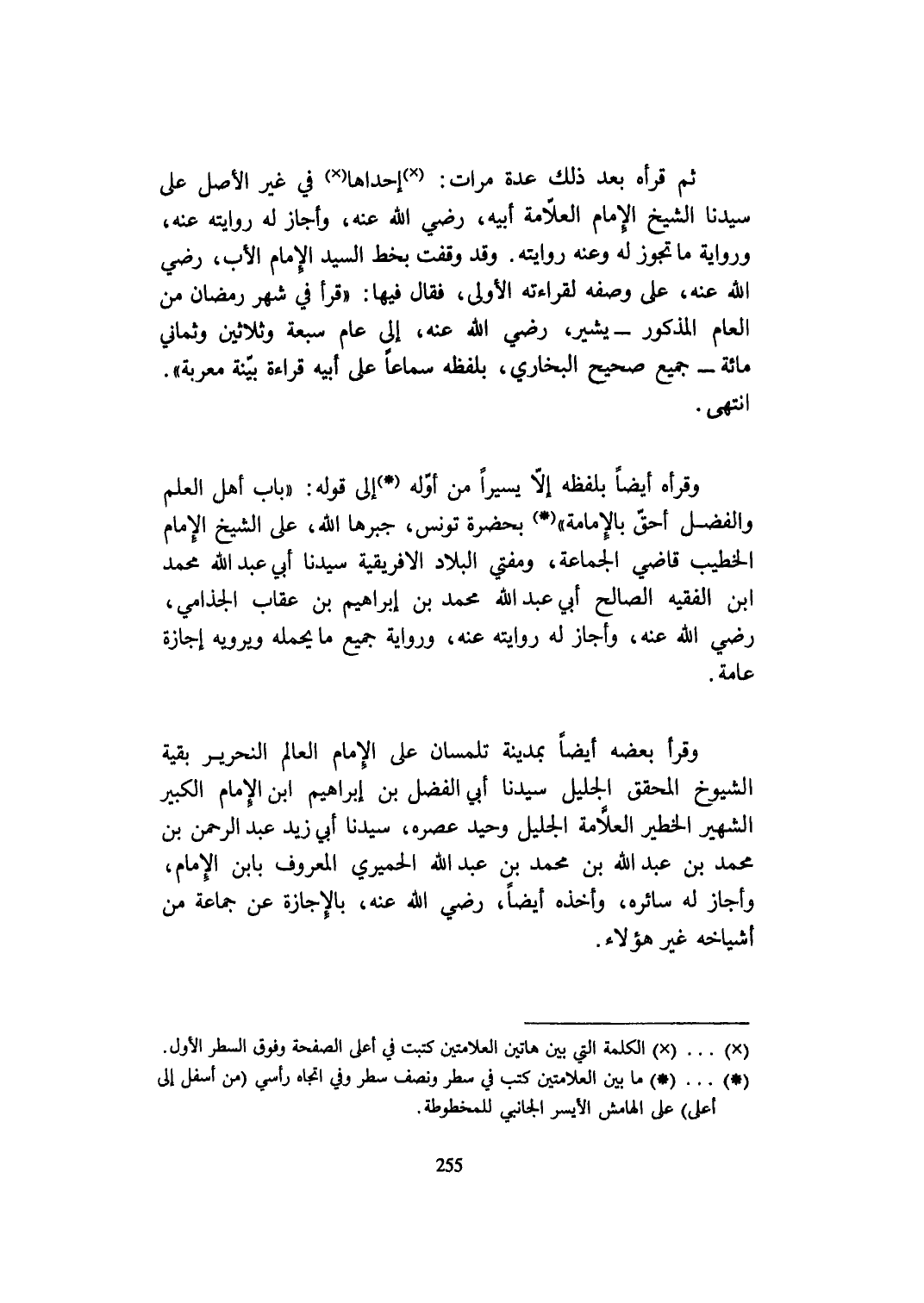 وَقَرَأَ بعضه أَيْضا بِمَدِينَة تلمسان على الإِمَام الْعَالم النحرير بَقِيَّة الشُّيُوخ الْمُحَقق الْجَلِيل سيدنَا أبي الْفضل بن إِبْرَاهِيم ابْن الإِمَام الْكَبِير الشهير الخطير الْعَلامَة الْجَلِيل وحيد عصره سيدنَا أبي زيد عبد الرَّحْمَن بن مُحَمَّد بن عبد الله بن مُحَمَّد بن عبد الله الْحِمْيَرِي الْمَعْرُوف بِابْن الإِمَام وَأَجَازَ لَهُ سائره وَأَخذه أَيْضا رَضِي الله عَنهُ بِالْإِجَازَةِ عَن جمَاعَة من أشياخه غير هَؤُلَاءِ