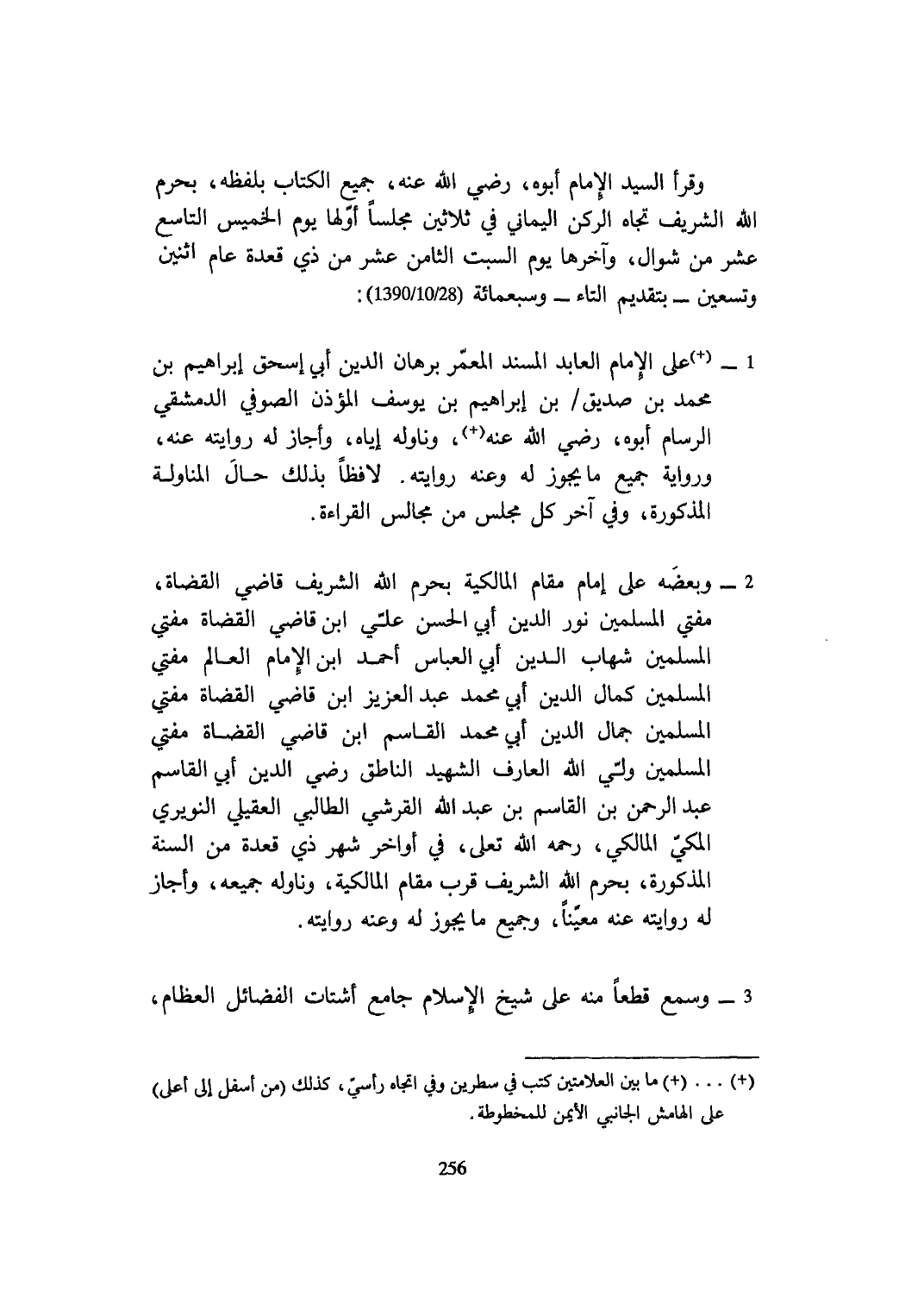 2 - وَبَعضه على إِمَام مقَام الْمَالِكِيَّة بحرم الله الشريف قَاضِي الْقُضَاة مفتي الْمُسلمين نور الدّين أبي الْحسن عَليّ ابْن قَاضِي الْقُضَاة مفتي الْمُسلمين شهَاب الدّين أبي الْعَبَّاس أَحْمد ابْن الإِمَام الْعَالم مفتي الْمُسلمين كَمَال الدّين أبي مُحَمَّد عبد الْعَزِيز ابْن قَاضِي الْقُضَاة مفتي الْمُسلمين جمال الدّين أبي مُحَمَّد الْقَاسِم ابْن قَاضِي الْقُضَاة مفتي الْمُسلمين ولي الله الْعَارِف الشَّهِيد النَّاطِق رَضِي الدّين أبي الْقَاسِم عبد الرَّحْمَن بن الْقَاسِم بن عبد الله الْقرشِي الطَّالِبِيُّ الْعقيلِيّ النويري الْمَكِّيّ الْمَالِكِي رَحمَه الله تعلى فِي أَوَاخِر شهر ذِي قعدة من السّنة الْمَذْكُورَة بحرم الله الشريف قرب مقَام الْمَالِكِيَّة وناوله جَمِيعه وَأَجَازَ لَهُ رِوَايَته عَنهُ معينا وَجَمِيع مَا يجوز لَهُ وَعنهُ رِوَايَته