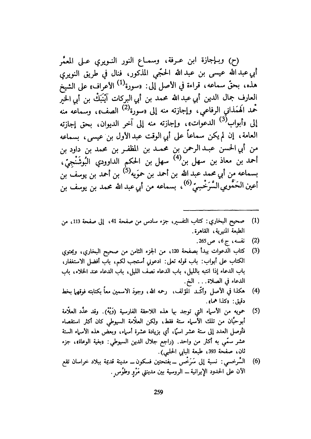 ح وبإجازة ابْن عَرَفَة وَسَمَاع النو النويري على المعمر أبي عبد الله عِيسَى بن عبد الله الحجي الْمَذْكُور فنال فِي طَرِيق النويري هَذِه بِحَق سَمَاعه قِرَاءَة فِي الأَصْل إِلَى سُورَة الْأَعْرَاف على الشَّيْخ الْعَارِف جمال الدّين أبي عبد الله مُحَمَّد بن أبي البركات أينبك بن أبي الْخَيْر حمد الهمذاني الرِّفَاعِي وإجازته مِنْهُ إِلَى سُورَة الصَّفّ وسماعه مِنْهُ إِلَى أَبْوَاب الدَّعْوَات وإجازته مِنْهُ إِلَى آخر الدِّيوَان بِحَق إِجَازَته الْعَامَّة إِن لم يكن سَمَاعا على أبي الْوَقْت عبد الأول بن عِيسَى بِسَمَاعِهِ من أبي الْحسن عبد الرَّحْمَن بن مُحَمَّد بن المظفر بن مُحَمَّد بن دَاوُد بن أَحْمد بن معَاذ بن سهل بن سهل بن الحكم الداوودي البوشنجي بِسَمَاعِهِ من أبي مُحَمَّد عبد الله بن أَحْمد بن حمويه بن أَحْمد بن يُوسُف بن أعين الحمويي السَّرخسِيّ بِسَمَاعِهِ من أبي عبد الله مُحَمَّد بن يُوسُف بن