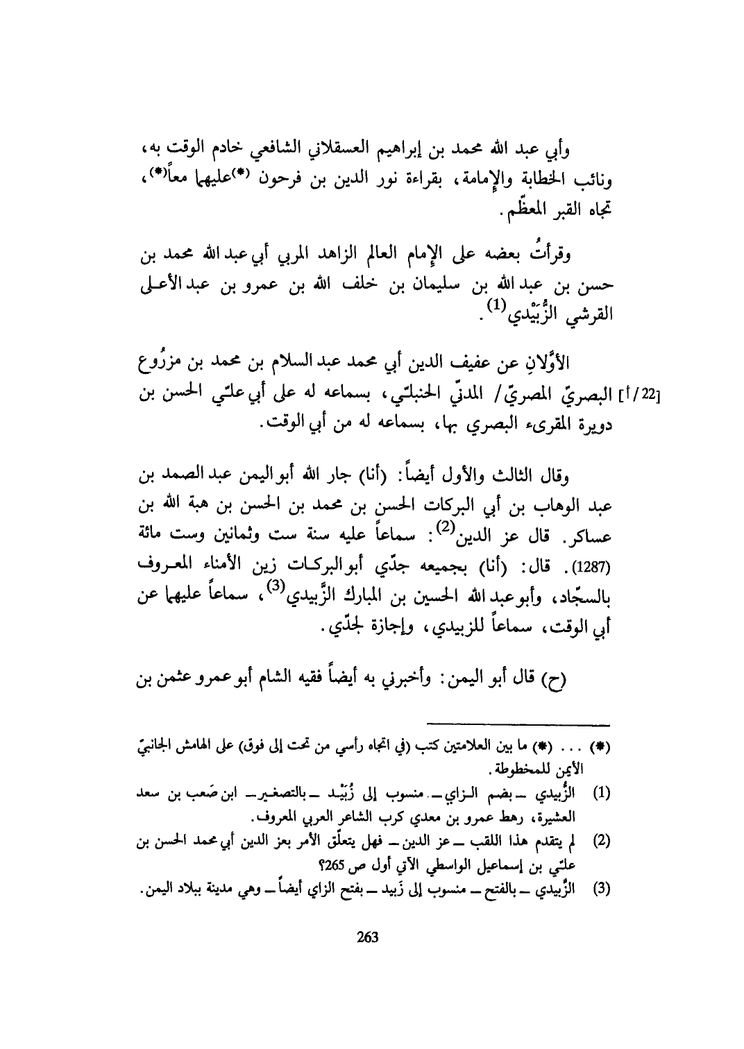 وَقَالَ الثَّالِث وَالْأول أَيْضا أَنا جَار الله أَبُو الْيمن عبد الصَّمد بن عبد الْوَهَّاب بن أبي البركات الْحسن بن مُحَمَّد بن الْحسن بن هبة الله بن عَسَاكِر قَالَ عز الدّين سَمَاعا عَلَيْهِ سنة سِتّ وَثَمَانِينَ وست مائَة 1287 قَالَ أَنا بِجَمِيعِهِ جدي أَبُو البركات زين الْأُمَنَاء الْمَعْرُوف بالسجاد وَأَبُو عبد الله الْحُسَيْن بن الْمُبَارك الزبيدِيّ سَمَاعا عَلَيْهِمَا عَن أبي الْوَقْت سَمَاعا للزبيدي وإجازة لجدي