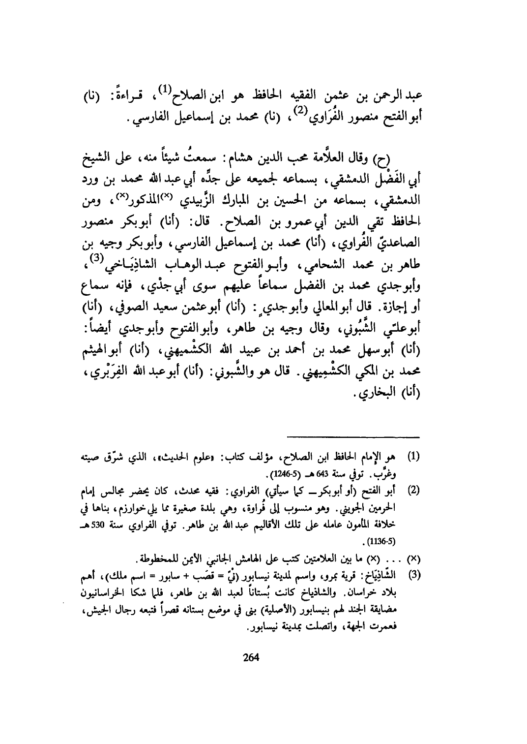 عبد الرَّحْمَن بن عثمن الْفَقِيه الْحَافِظ هُوَ ابْن الصّلاح قِرَاءَة نَا أَبُو الْفَتْح مَنْصُور الفراوي نَا مُحَمَّد بن إِسْمَاعِيل الْفَارِسِي
