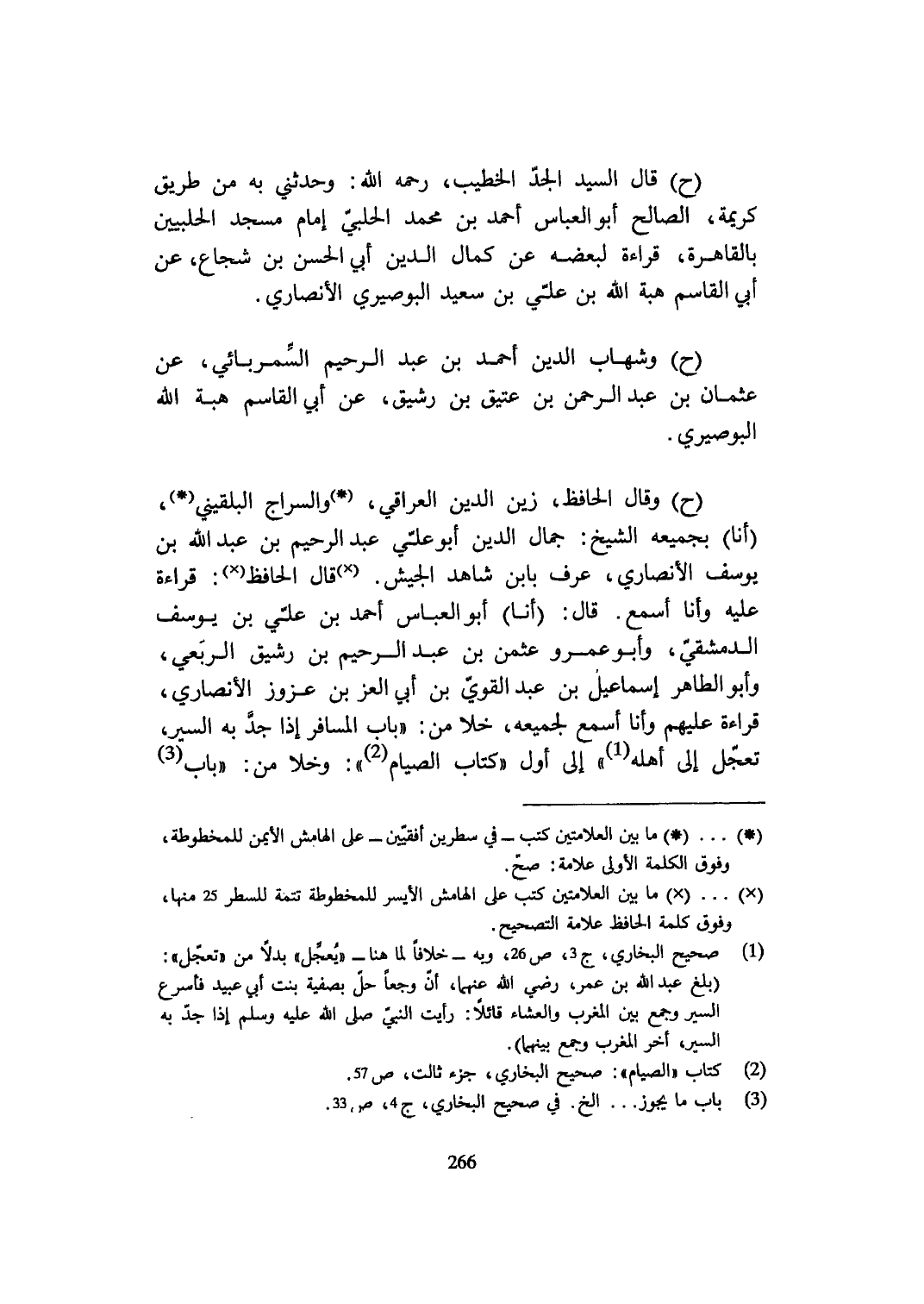 ح وَقَالَ الْحَافِظ زين الدّين الْعِرَاقِيّ والسراج البُلْقِينِيّ أَنا بِجَمِيعِهِ الشَّيْخ جمال الدّين أَبُو عَليّ عبد الرَّحِيم بن عبد الله بن يُوسُف الْأنْصَارِيّ عرف بِابْن شَاهد الْجَيْش قَالَ الْحَافِظ قِرَاءَة عَلَيْهِ وَأَنا أسمع قَالَ أَنا أَبُو الْعَبَّاس أَحْمد بن عَليّ بن يُوسُف الدِّمَشْقِي وَأَبُو عَمْرو عثمن بن عبد الرَّحِيم بن رَشِيق الربعِي وَأَبُو الطَّاهِر إِسْمَاعِيل بن عبد الْقوي بن أبي الْعِزّ بن عزوز الْأنْصَارِيّ قِرَاءَة عَلَيْهِم وَأَنا أسمع لجميعه خلا من بَاب الْمُسَافِر إِذا جد بِهِ السّير تعجل إِلَى أَهله إِلَى أول كتاب الصّيام وخلا من بَاب
