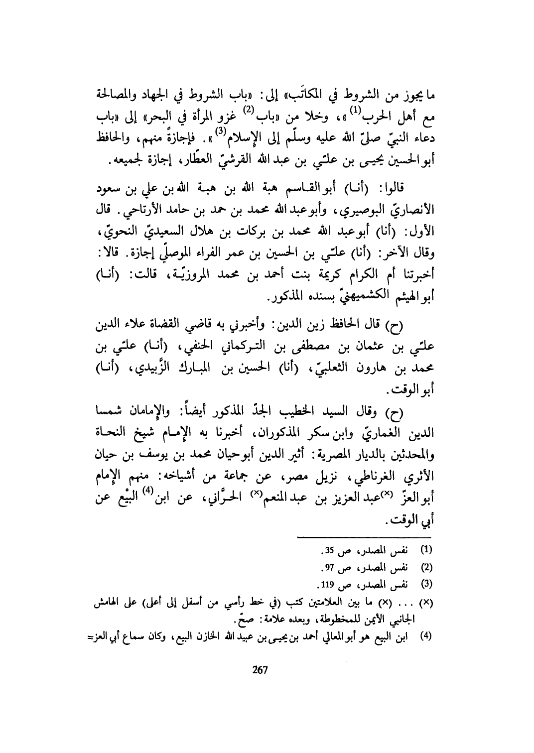 ح وَقَالَ السَّيِّد الْخَطِيب الْجد الْمَذْكُور أَيْضا والإمامان شمسا الدّين الغماري وَابْن سكر الْمَذْكُورَان أخبرنَا بِهِ الإِمَام شيخ النُّحَاة والمحدثين بالديار المصرية أثير الدّين أَبُو حَيَّان مُحَمَّد بن يُوسُف بن حَيَّان الأثري الغرناطي نزيل مصر عَن جمَاعَة من أشياخه مِنْهُم الإِمَام أَبُو الْعِزّ عبد الْعَزِيز بن عبد الْمُنعم الْحَرَّانِي عَن ابْن البيع عَن أبي الْوَقْت