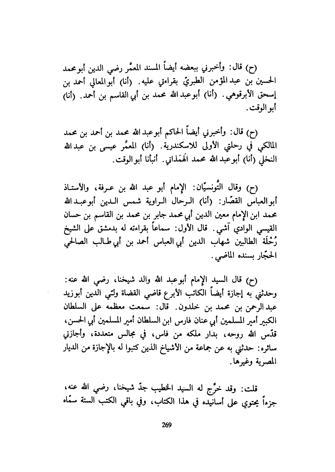 ح قَالَ السَّيِّد الإِمَام أَبُو عبد الله وَالِد شَيخنَا رَضِي الله عَنهُ وحَدثني بِهِ إجَازَة أَيْضا الْكَاتِب الأبرع قَاضِي الْقُضَاة ولي الدّين أَبُو زيد عبد الرَّحْمَن بن مُحَمَّد بن خلدون قَالَ سَمِعت معظمه على السُّلْطَان الْكَبِير أَمِير الْمُسلمين أبي عنان فَارس ابْن السُّلْطَان أَمِير الْمُسلمين أبي الْحسن قدس الله روحه بدار ملكه من فاس فِي مجَالِس مُتعَدِّدَة وأجازني سائره حَدثنِي بِهِ عَن جمَاعَة من الْأَشْيَاخ الَّذين كتبُوا لَهُ بِالْإِجَازَةِ من الديار المصرية وَغَيرهَا