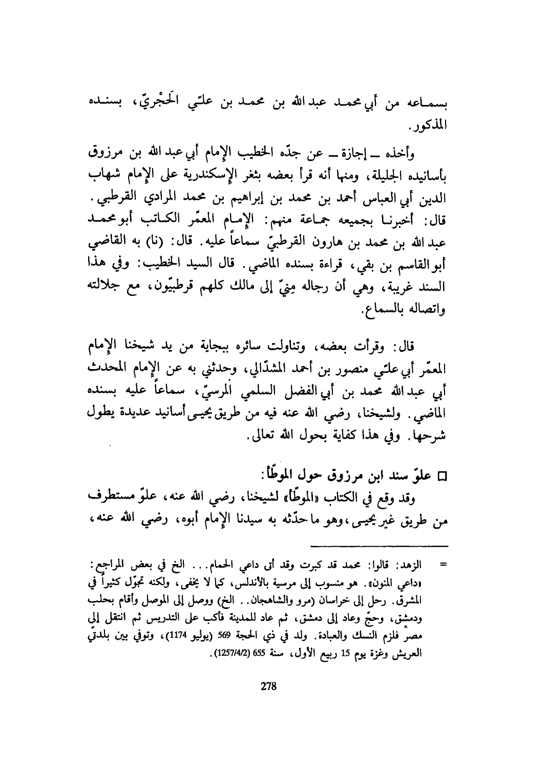 قَالَ أخبرنَا بِجَمِيعِهِ جمَاعَة مِنْهُم الإِمَام المعمر الْكَاتِب أَبُو مُحَمَّد عبد الله بن مُحَمَّد بن هَارُون الْقُرْطُبِيّ سَمَاعا عَلَيْهِ قَالَ نَا بِهِ القَاضِي أَبُو الْقَاسِم بن بَقِي قِرَاءَة بِسَنَدِهِ الْمَاضِي قَالَ السَّيِّد الْخَطِيب وَفِي هَذَا السَّنَد غَرِيبَة وَهِي أَن رِجَاله مني إِلَى مَالك كلهم قرطبيون مَعَ جلالته واتصاله بِالسَّمَاعِ