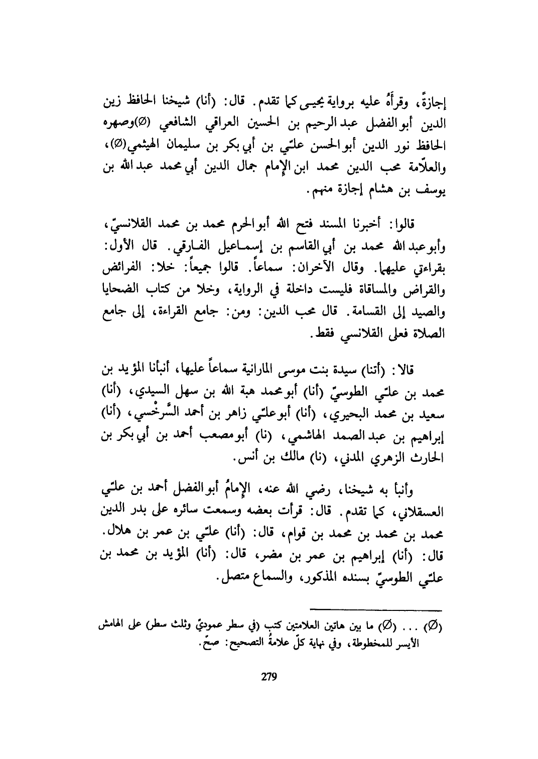 وأنبأ بِهِ شَيخنَا رَضِي الله عَنهُ الإِمَام أَبُو الْفضل أَحْمد بن عَليّ الْعَسْقَلَانِي كَمَا تقدم قَالَ قَرَأت بعضه وَسمعت سائره على بدر الدّين مُحَمَّد بن مُحَمَّد بن مُحَمَّد بن قوام قَالَ أَنا عَليّ بن عمر بن هِلَال قَالَ أَنا إِبْرَاهِيم بن عمر بن مُضر قَالَ أَنا الْمُؤَيد بن مُحَمَّد بن عَليّ الطوسي بِسَنَدِهِ الْمَذْكُور وَالسَّمَاع مُتَّصِل