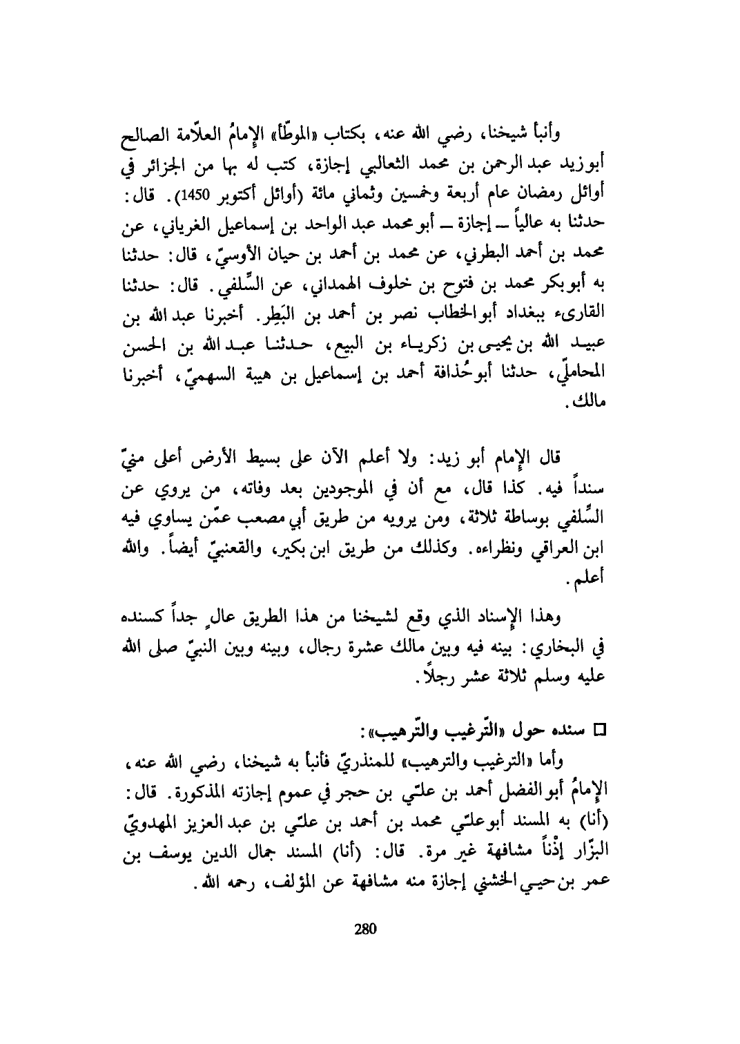 وأنبأ شَيخنَا رَضِي الله عَنهُ بِكِتَاب الْمُوَطَّأ الإِمَام الْعَلامَة الصَّالح أَبُو زيد عبد الرَّحْمَن بن مُحَمَّد الثعالبي إجَازَة كتب لَهُ بهَا من الجزائر فِي أَوَائِل رَمَضَان عَام أَرْبَعَة وَخمسين وثماني مائَة أَوَائِل أكتوبر 1450 قَالَ حَدثنَا بِهِ عَالِيا إجَازَة أَبُو مُحَمَّد عبد الْوَاحِد بن إِسْمَاعِيل الغرياني عَن مُحَمَّد بن أَحْمد البطرني عَن محمدبن أَحْمد بن حَيَّان الأوسي قَالَ حَدثنَا بِهِ أَبُو بكر مُحَمَّد بن فتوح بن خلوف الْهَمدَانِي عَن السلَفِي قَالَ حَدثنَا القارىء بِبَغْدَاد أَبُو الْخطاب نصر بن أَحْمد بن البطر أخبرنَا عبد الله بن عبيد الله بن يحيى بن زَكَرِيَّاء بن البيع حَدثنَا عبد الله بن الْحسن الْمحَامِلِي حَدثنَا أَبُو حذافة أَحْمد بن إِسْمَاعِيل بن هَيْبَة السَّهْمِي أخبرنَا مَالك