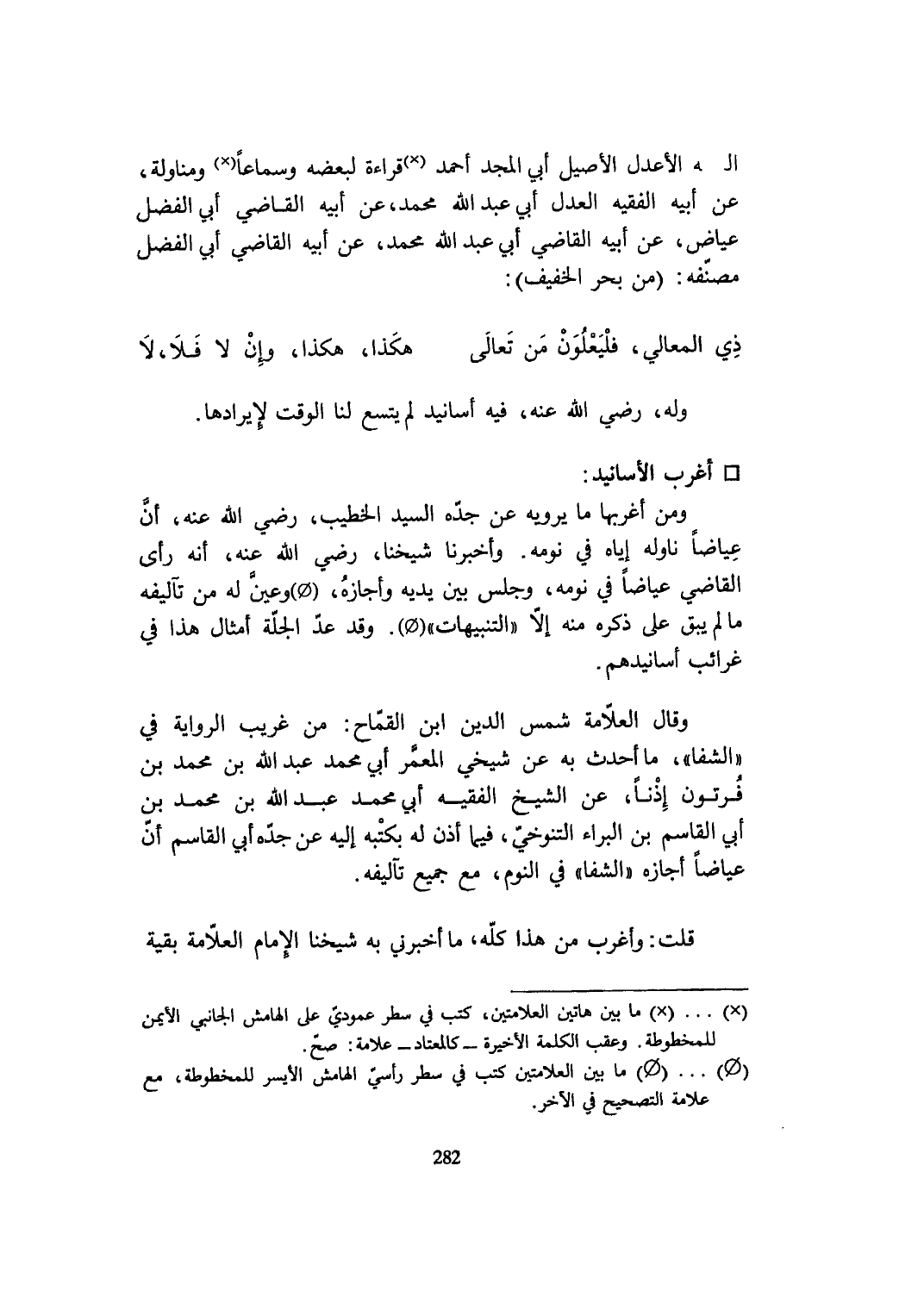 وَمن أغربها مَا يرويهِ عَن جده السَّيِّد الْخَطِيب رَضِي الله عَنهُ أَن عياضا نَاوَلَهُ إِيَّاه فِي نَومه وَأخْبرنَا شَيخنَا رَضِي الله عَنهُ أَنه رأى القَاضِي وعياضا فِي نَومه وَجلسَ بَين يَدَيْهِ وَأَجَازَهُ وَعين لَهُ من تآليفه مَا لم يبْق على ذكره مِنْهُ إِلَّا التَّنْبِيهَات وَقد عد الجلة أَمْثَال هَذَا فِي غرائب أسانيدهم