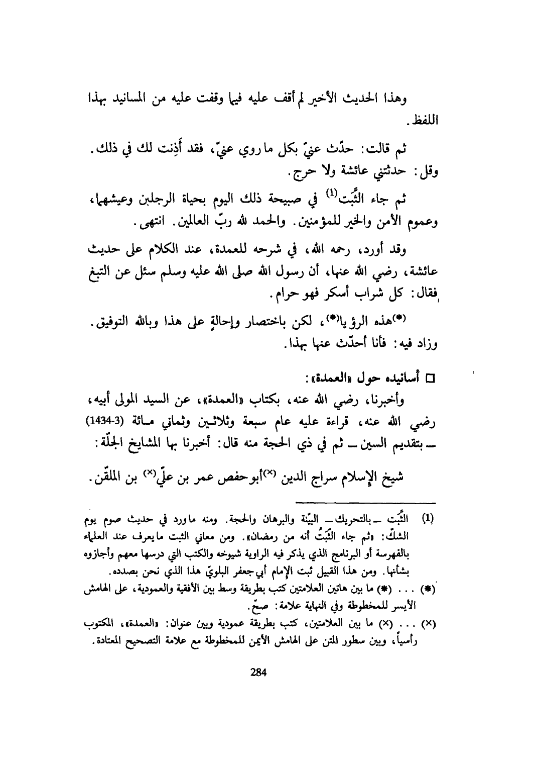 وَأخْبرنَا رَضِي الله عَنهُ بِكِتَاب الْعُمْدَة عَن السَّيِّد الْمولى أَبِيه رَضِي الله عَنهُ قِرَاءَة عَلَيْهِ عَام سَبْعَة وَثَلَاثِينَ وثماني مائَة 3 - 1434 بِتَقْدِيم السِّين ثمَّ فِي ذِي الْحجَّة مِنْهُ قَالَ أخبرنَا بهَا الْمَشَايِخ الجلة
