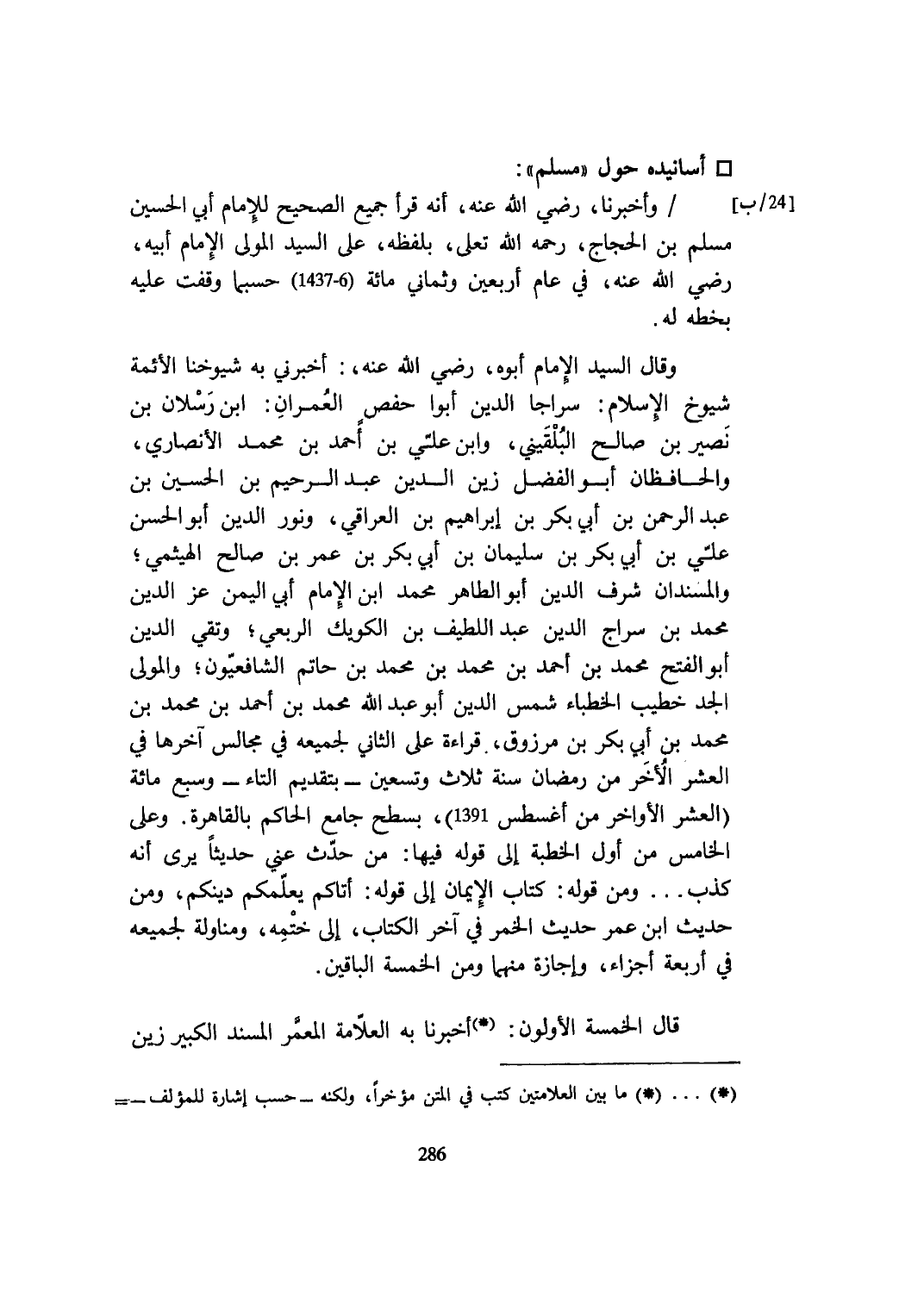 وَأخْبرنَا رَضِي الله عَنهُ أَنه قَرَأَ جَمِيع الصَّحِيح للْإِمَام أبي الْحُسَيْن مُسلم بن الْحجَّاج رَحمَه الله تعلى بِلَفْظِهِ على السَّيِّد الْمولى الإِمَام أَبِيه رَضِي الله عَنهُ فِي عَام أَرْبَعِينَ وثماني مائَة 6 - 1437 حَسْبَمَا وقفت عَلَيْهِ بِخَطِّهِ لَهُ