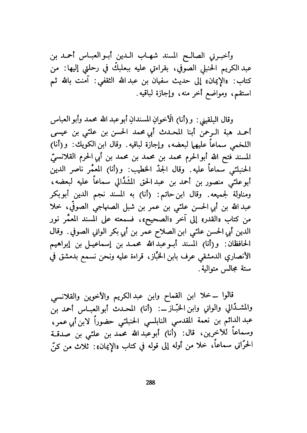 وَأَخْبرنِي الصَّالح الْمسند شهَاب الدّين أَبُو الْعَبَّاس أَحْمد بن عبد الْكَرِيم الْحَنْبَلِيّ الصُّوفِي بِقِرَاءَتِي عَلَيْهِ ببعلبك فِي رحلتي إِلَيْهَا من كتاب الْإِيمَان إِلَى حَدِيث سُفْيَان بن عبد الله الثَّقَفِيّ آمَنت بِاللَّه ثمَّ اسْتَقِم ومواضع آخر مِنْهُ وإجازة لباقيه