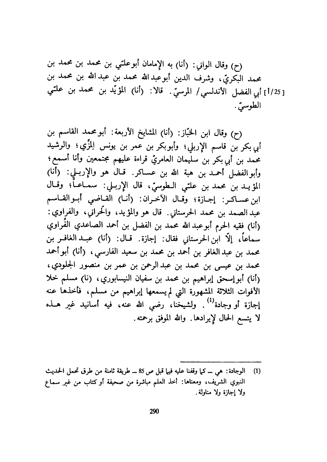 ح وَقَالَ الواني أَنا بِهِ الإمامان أَبُو عَليّ بن مُحَمَّد بن مُحَمَّد بن مُحَمَّد الْبكْرِيّ وَشرف الدّين أَبُو عبد الله مُحَمَّد بن عبد الله بن مُحَمَّد بن أبي الْفضل اندلسي المرسي قَالَا أَنا الْمُؤَيد بن مُحَمَّد بن عَليّ الطوسي