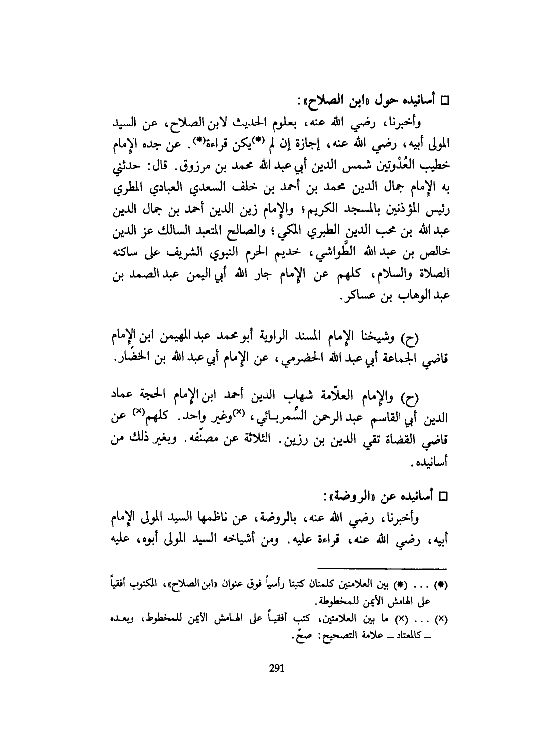 وَأخْبرنَا رَضِي الله عَنهُ بعلوم الحَدِيث لِابْنِ الصّلاح عَن السَّيِّد الْمولى أَبِيه رَضِي الله عَنهُ إجَازَة إِن لم يكن قِرَاءَة عَن جده الإِمَام خطيب العدوتين شمس الدّين أبي عبد الله مُحَمَّد بن مَرْزُوق قَالَ حَدثنِي بِهِ الإِمَام جمال الدّين مُحَمَّد بن أَحْمد بن خلف السَّعْدِيّ الْعَبَّادِيّ المطري رَئِيس المؤذنين بِالْمَسْجِدِ الْكَرِيم وَالْإِمَام زين الدّين أَحْمد بن جمال الدّين عبد الله بن محب الدّين الطَّبَرِيّ الْمَكِّيّ والصالح المتعبد السالك عز الدّين خَالص بن عبد الله الطواشي خديم الْحرم النَّبَوِيّ الشريف على ساكنه الصَّلَاة وَالسَّلَام كلهم عَن الإِمَام جَار الله أبي الْيمن عبد الصَّمد بن عبد الْوَهَّاب بن عَسَاكِر