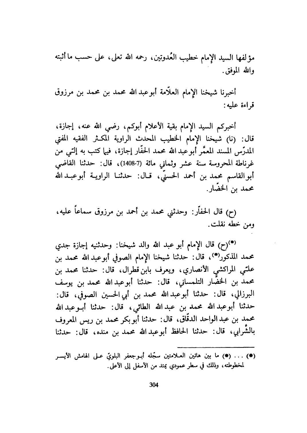 أخبرنَا شَيخنَا الإِمَام الْعَلامَة أَبُو عبد الله مُحَمَّد بن مُحَمَّد بن مَرْزُوق قِرَاءَة عَلَيْهِ