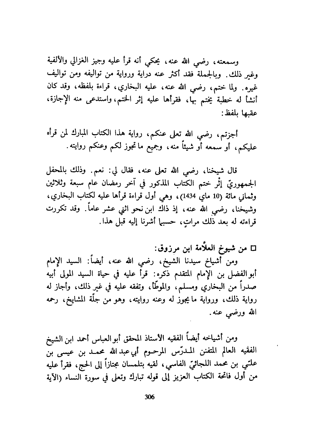 قَالَ شَيخنَا رَضِي الله تعلى عَنهُ فَقَالَ لي نعم وَذَلِكَ بالمحفل الجمهوري إِثْر ختم الْكتاب الْمَذْكُور فِي آخر رَمَضَان عَام سَبْعَة وَثَلَاثِينَ وثماني مائَة 10 ماي 1434 وَهِي أول قِرَاءَة قَرَأَهَا عَلَيْهِ لكتاب البُخَارِيّ وَشَيخنَا رَضِي الله عَنهُ إِذْ ذَاك ابْن نَحْو اثْنَي عشر عَاما وَقد تَكَرَّرت قِرَاءَته لَهُ بعد ذَلِك مَرَّات حَسْبَمَا أَشَرنَا إِلَيْهِ قبل هَذَا